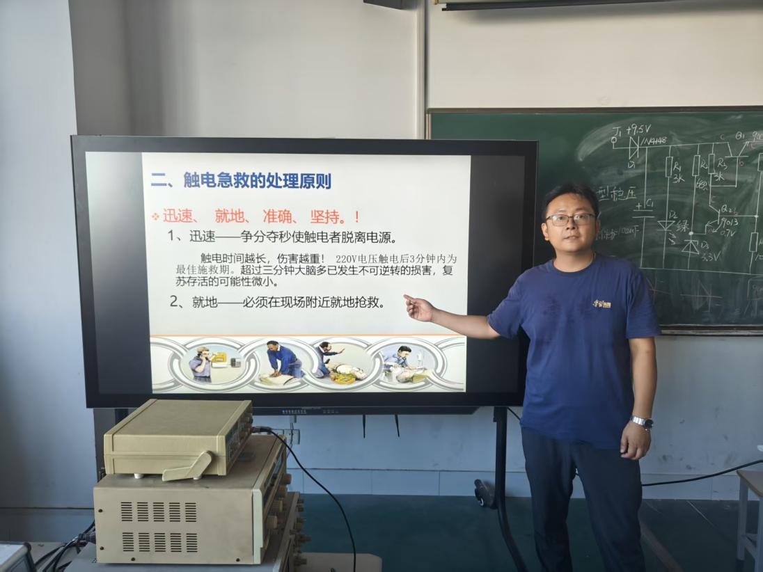 演练启动前,实训教师张杨齐开展演练前的安全触电教育,演练中明确了指挥组、应急组、救护组、保障组的职责,保障组提前对演练场地进行安全排查,准备了模拟触电道具等,并对参与演练的教师及学生骨干进行应急技能培训,确保演练安全、有序开展。