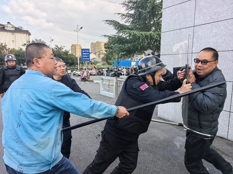 演练设置两个模拟场景,分别位于校园东门与北门区域。首场演练在东门展开,模拟一名社会人员拒不配合登记、强行闯卡的情景。门岗保安员立即启动“一键报警系统”,最小应急单元迅速携带防护装备赶赴现场。队员们分工明确,通过语言控制、队形展开与器械使用,迅速将“闯卡人员”有效隔离并带离,恢复了出入口秩序。