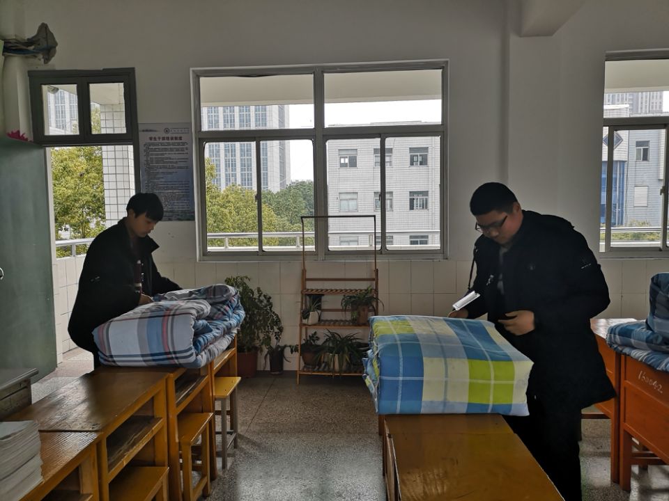 我系利用休息时间由学生会成员组织被子叠放有困难的学生于5号楼3楼进行叠被子示范,手把手教学。通过学生会学生多次的精心教学示范与学生用心的学习演练,学生的宿舍内务得到了极大的改善。