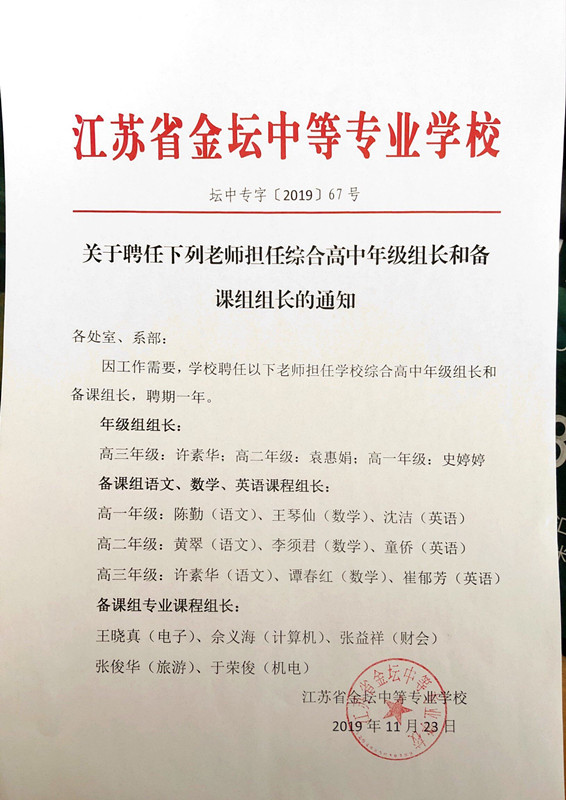 关于聘任老师担任综合高中年级组长和备课组组长的通知