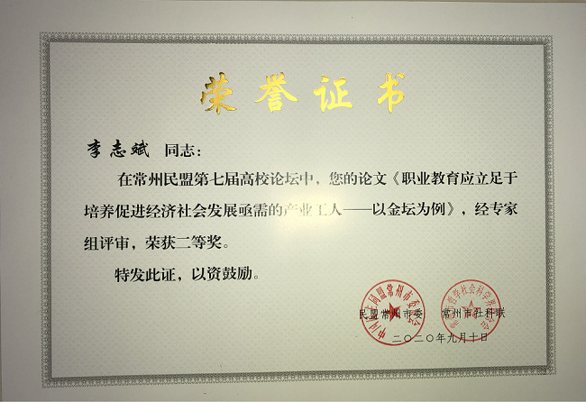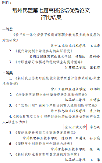 我校民盟支部主委李志斌撰写的调研报告《职业教育应立足于培养促进经济社会发展亟需的产业工人——以金坛为例》获得二等奖。这是我校首次参加常州高校论坛,初次亮相就有不俗表现,得到了论坛主办方的充分肯定,也引起常州各所高校的侧目关注。据悉,我校是历年来参加该论坛的唯一的区县级开放大学。