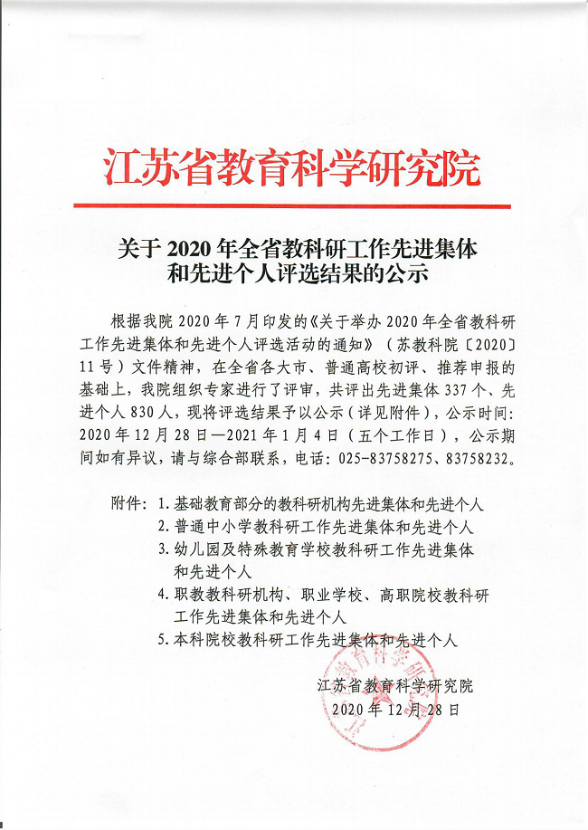 近日,根据江苏省教育科学研究院公示的2020年全省教科研工作先进集体和先进个人评选结果,我校荣获2020年“江苏省教科研先进集体”称号,这是我校在继11月份荣获“常州市教科研基地”的称号后斩获的又一殊荣。彰显了我校坚持“科研兴校、优质发展”战略取得了显著成效。