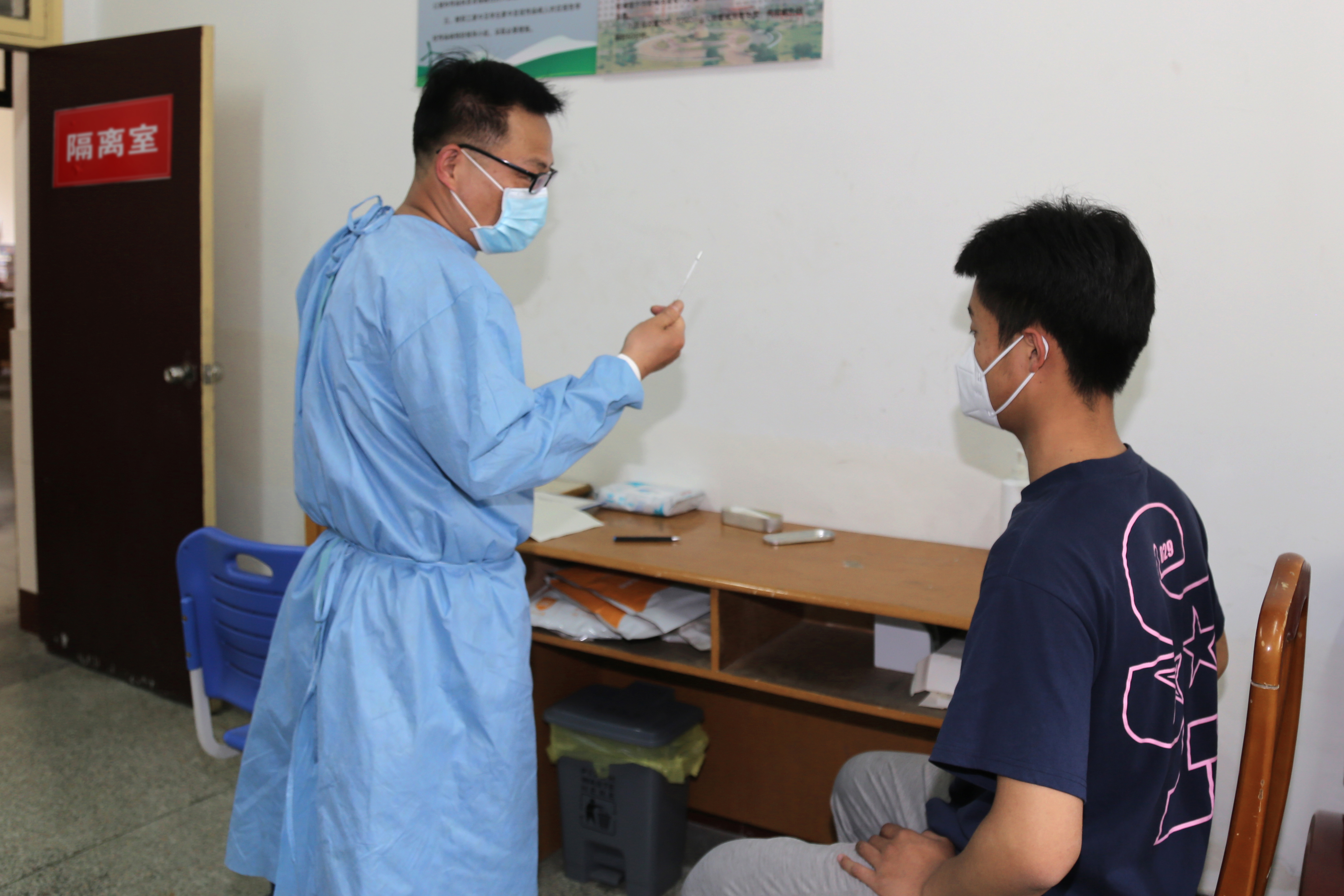 演练现场,模拟了学生核酸检测、教室学生测温、宿舍学生体温异常处置、突发可疑病例医务室处置流程等具体情境,进行了具体安排。组织专人负责维持秩序,发出各项演练指令,所有演练人员依据指令有序地完成各项演练流程,自觉有序排好队伍,保持安全距离,入校扫“场所码”,全程佩戴口罩,测量体温。