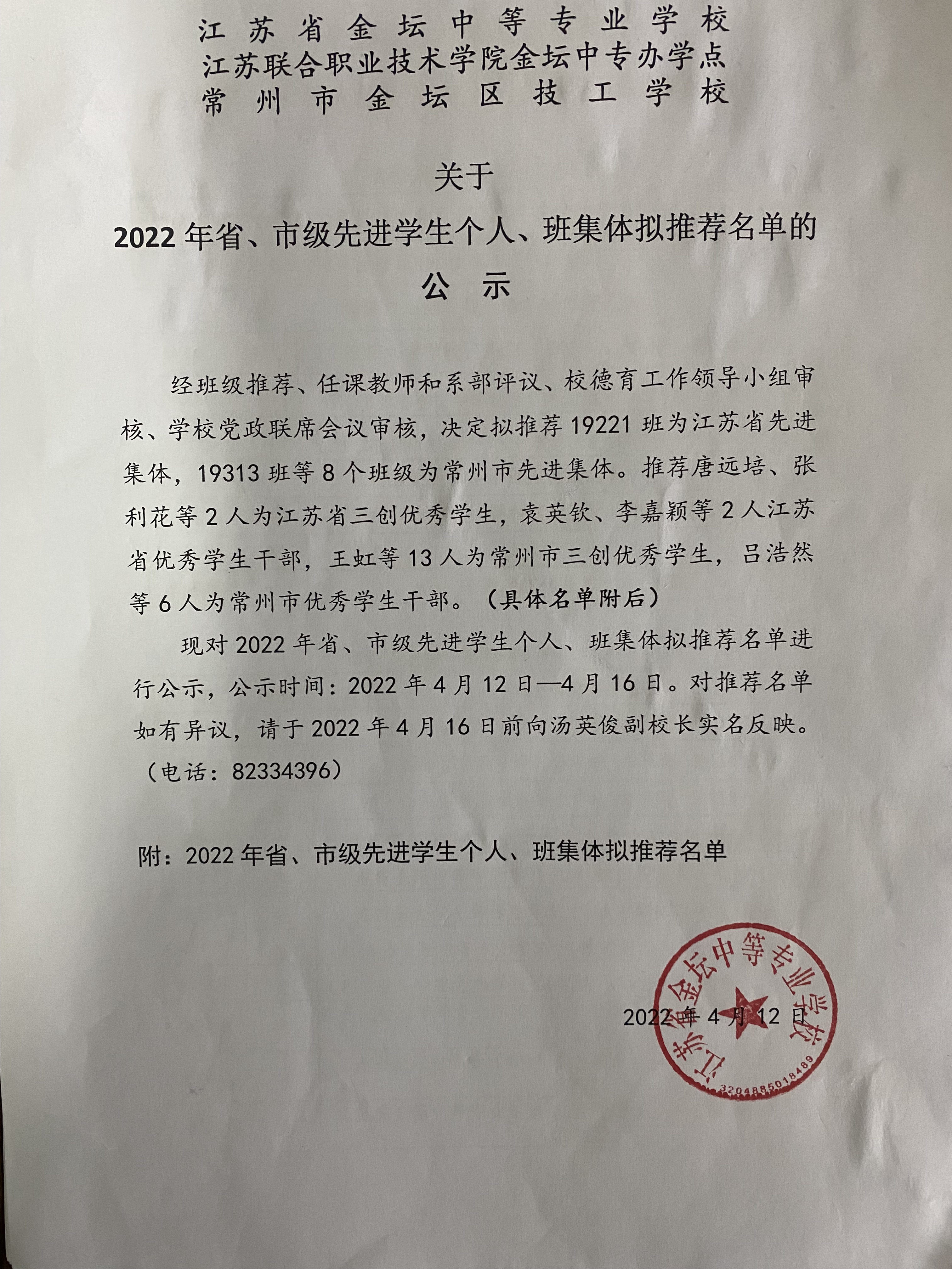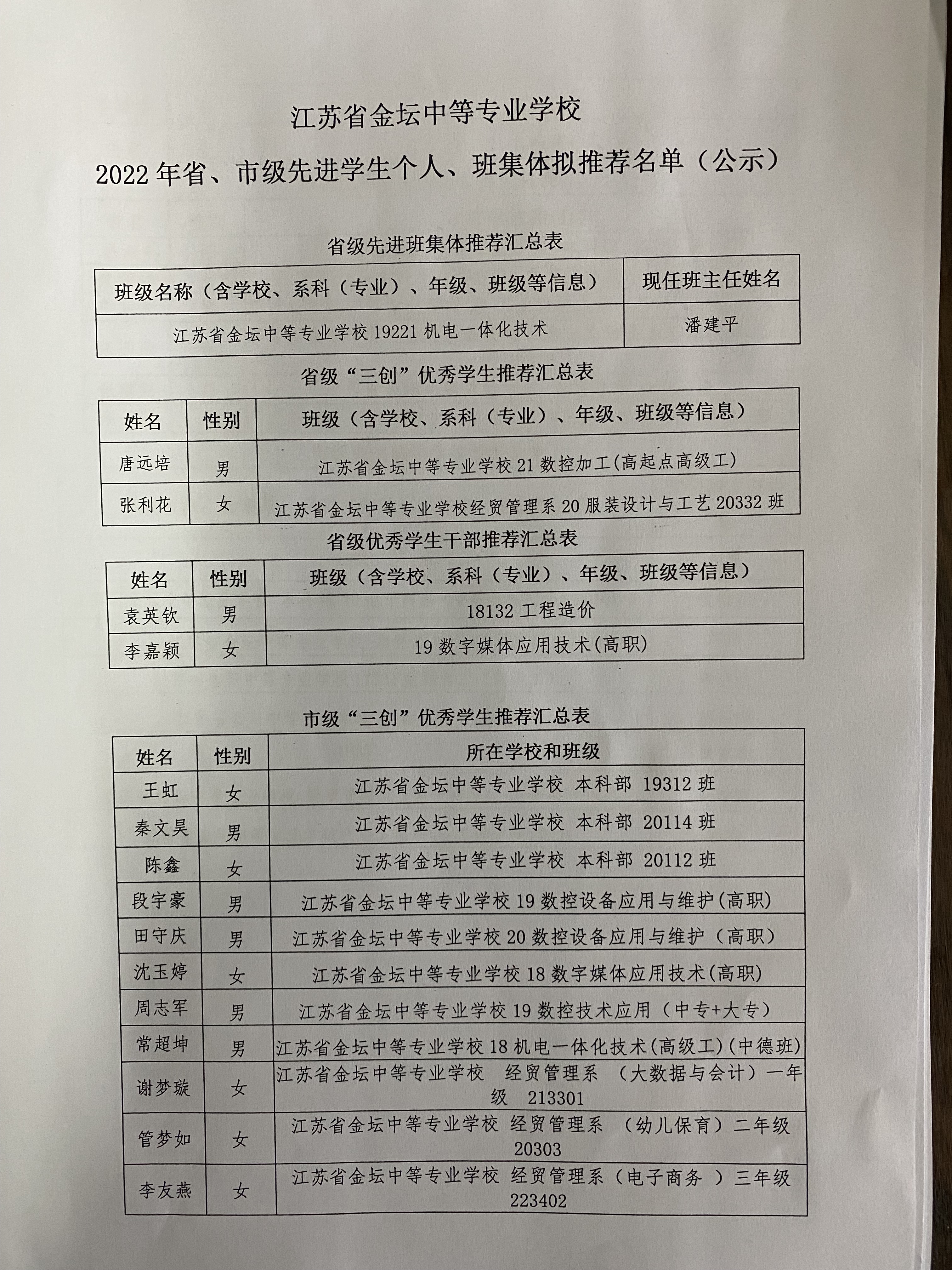 2022年省、市级先进学生个人、班集体拟推荐名单公示