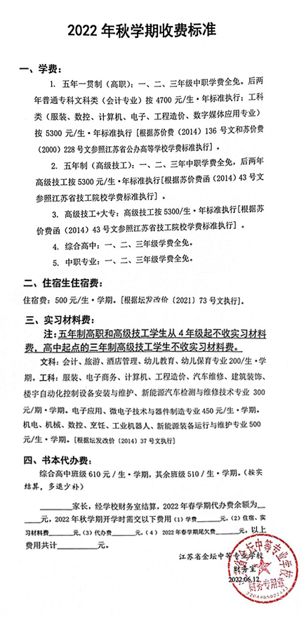 2022年秋学期收费标准