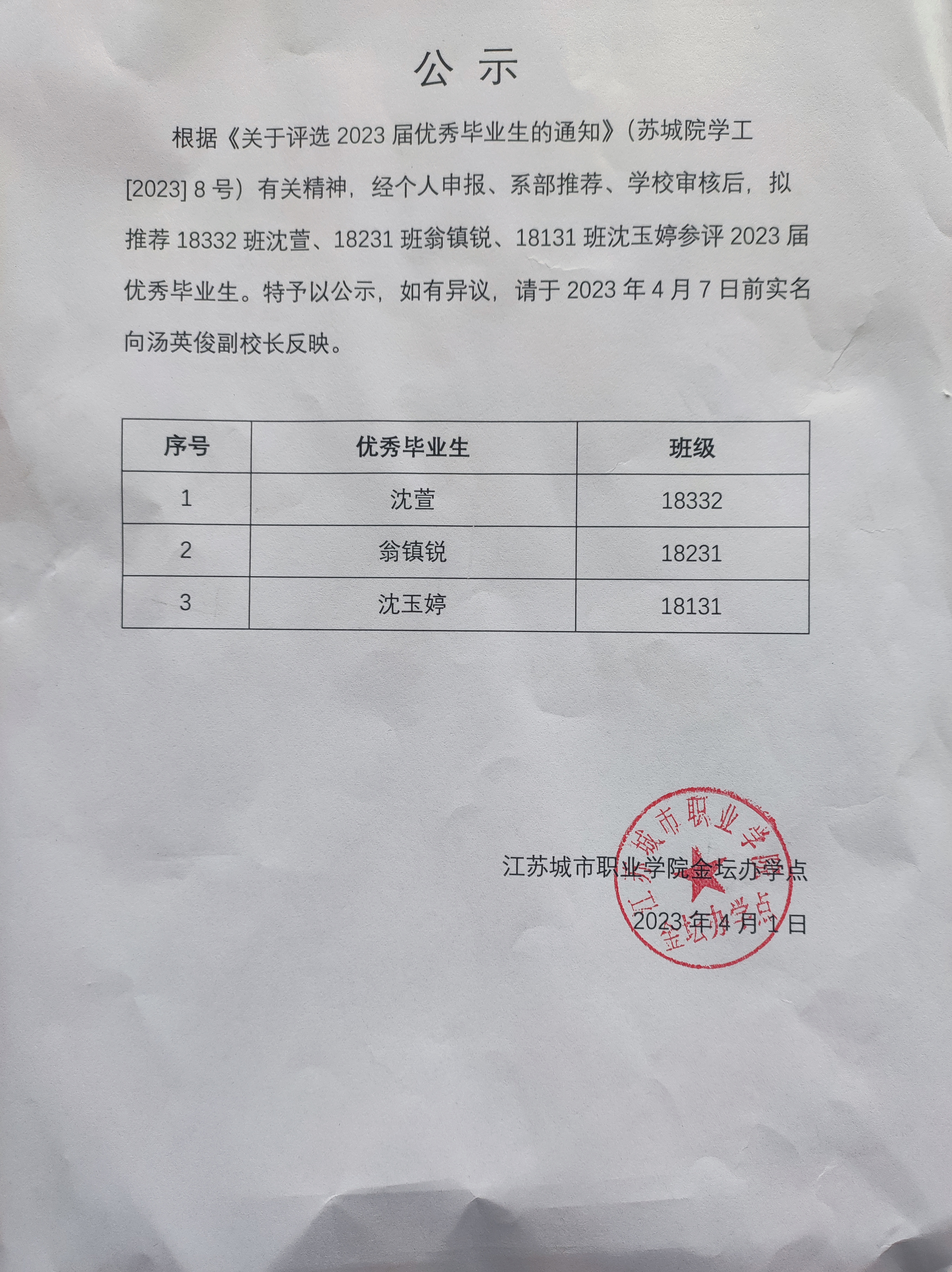 江苏城市职业学院金坛办学点2023届优秀毕业生公示