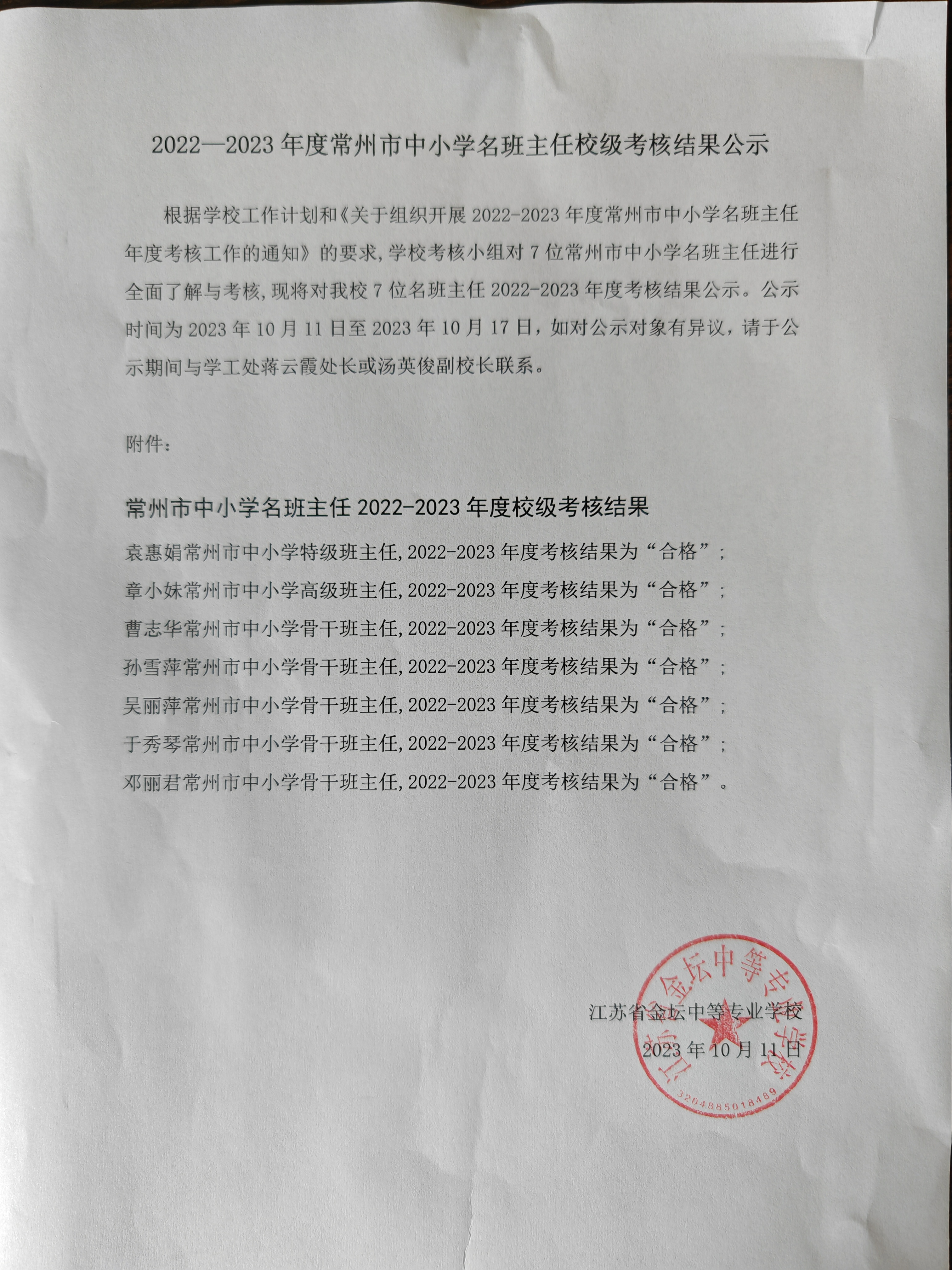 2022-2023年度常州市中小学名班主任校级考核结果公示