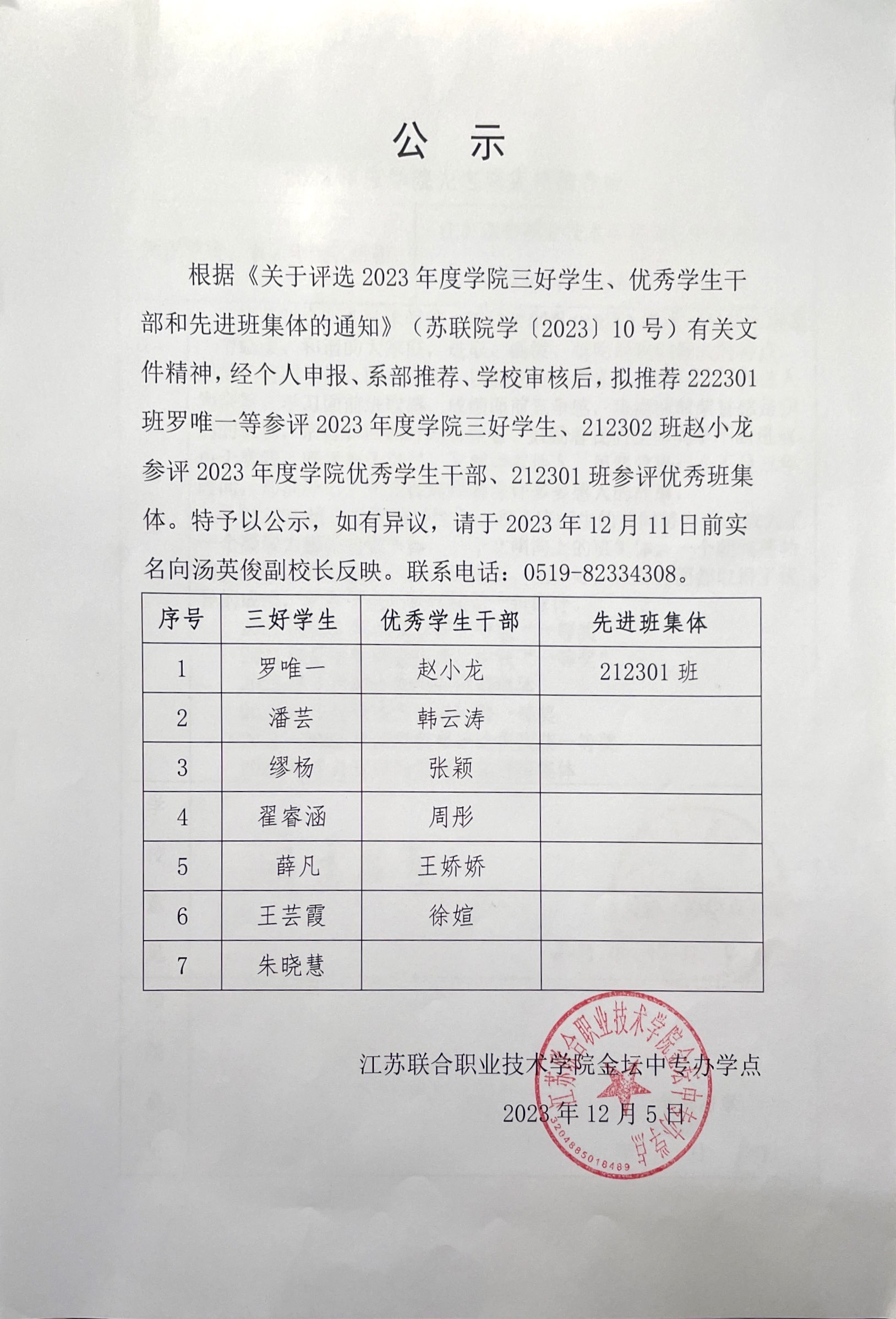 2023年度联院三好学生、优秀学生干部和先进班集体公示