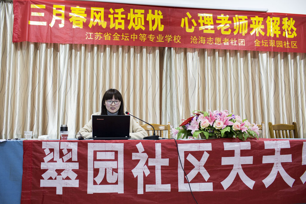三月春风话烦忧 心理老师来解愁 ________金坛中专党员、师生走进翠园社区开展“学雷锋送温暖”活动 2016年3月16日下午在校党总支、团委的精心组织下,部分党员、团员、心理学教师及沧海志愿社的20余名学生,在团委副书记钱丽华老师的带领下,来到翠园社区展开心理咨询和志愿保洁服务,收到良好的成效,受到社区居民们的热情欢迎。 为弘扬雷锋无私奉献的精神,充分展示职校青年党员、团员和师生朝气蓬勃、健康向上的精神风貌,校党总支、校团委发挥学校人才优势,从关爱居民身心健康出发,为居民提供心理咨询服务。 活动在翠园居委会二楼阅览室召开。活动前请居民们填写了一份社区心理咨询调查问卷,目的是掌握居民对心理咨询的需求情况;接着张璐老师作了《心理健康知识讲座》,她由生活中的案例讲起,谈及婆媳关系、邻里关系、亲子关系,情绪与健康的关系,案例亲切生动,道理浅显易懂,在提问互动中居民心理问题得到了疏导,同时踊跃回答的居民都能领到一份小奖品。讲座结束,还发放了社区心理疏导联系卡,以便跟踪服务。咨询会后,学校部分党团员和沧海志愿社的同学们套上手套和口罩,带着铁钳来到社区绿化带,捡拾起白色垃圾,不一会儿每人都装了满满一袋,志愿服务持续到4点多钟,受到居民和社区工作人员啧啧称赞。这次活动充分展示了我校党团员青年吃苦耐劳的坚强品质,也表现出中职学生服务社会、服务社区的无私精神。
