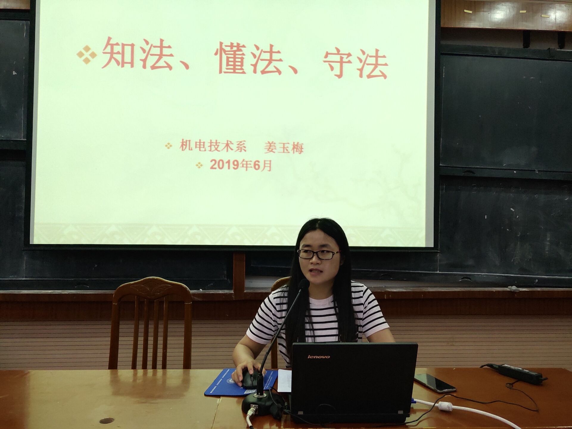 为进一步加强和推进学校法制教育工作,增强学生的法制观念,提高学生的法律意识, 2019年6月5日下午我校学工处副处长兼机电技术系书记姜玉梅老师为机电技术系新生开展了一场法制教育讲座。