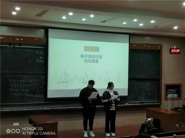 本次参赛的班级为电子系所有班级。有19132的潘欣,江玉琪同学,她们信心满满对阵17115班斗志昂扬的周鑫阳和马诚瑜;也有19131班的张扬和孙建荣同学壮志凌云叫嚣16132江星语和李鑫……双方展开激烈的竞争,都充分发挥了自己的智慧与团队合作精神。比赛分为必答题、抢答题等题型,选手纷纷积极参与,展现了他们深厚的文化积累以及对历史的了解。在抢答题题中,选手们不仅展现了其随机应变的能力,也体现了团队间的默契。落后方也不气馁,依然热情投入比赛当中。底下的同学认真的观看竞赛,他们各个摩拳擦掌,跃跃欲试。最后,比赛圆满的结束。