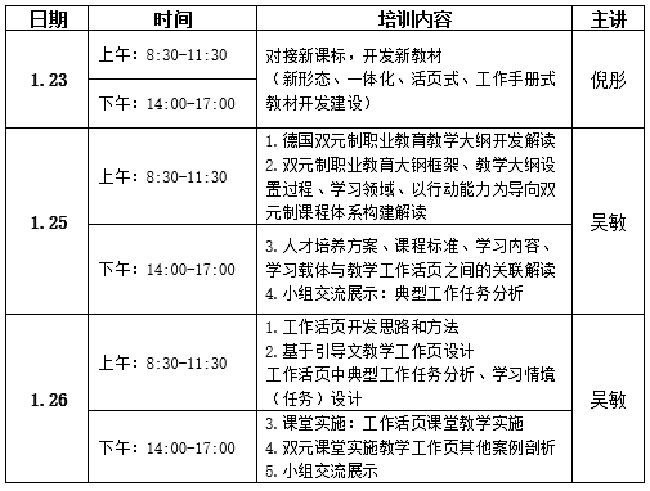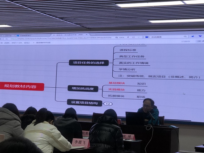 专家引领谋思路——专业建设开新局 我校开展“新型活页式、工作手册式教材”建设培训活动 为贯彻落实《国家职业教育改革实施方案》,加强双师型教师队伍建设,提升我校教师队伍的专业建设能力,着力开发一批精品示范性课程和优质新型活页式教材,经校党政研究,于1月23日至26日,举行青年骨干教师专题培训活动。 结合当前常态化疫情防控要求,本次研修活动采用线上线下混合式学习模式开展。由安徽汽车应用技师学院倪彤教授、上海石化工业学校吴敏老师担任主讲。 1月23日,倪彤教授从宏观政策解读、教材特色构思、教材内容规划、教材案例剖析、教材体例设计、呈现形式优化等六个层面对新教材建设进行了精彩阐述。整场讲座内容翔实、视角敏锐,既有理论支撑,又契合当下工作实际,使参训教师对“一体化教材开发”的理解更加透彻,为学校深化产教融合,共建共享“新型活页式”教材,建设好新形态一体化教材提供了有力参考。 本次培训围绕“双元制职教模式教学大纲及新型活页式教材开发”这一主题,详细解读双元制教学大纲的开发流程,深度剖析以学习领域为导向的教学大纲结构,结合学校实际,就构建本土化专业课程体系、开发学习情境和培训模块等进行讨论及学习,拓宽了教师的国际化视野,提升了现代化育人理念。