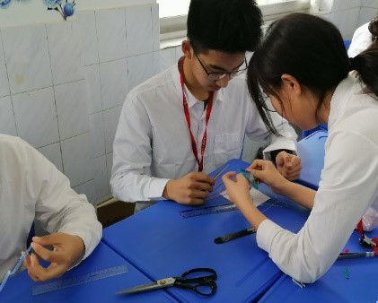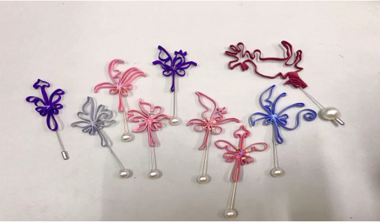 主持人引导同学讨论传达爱的方式,发现礼物多为现成品,因此发布了本次班会的手作任务——盘扣。在了解制作方法后,全班以小组为单位制作盘扣胸针。将专业知识融入其中,在盘扣的制作过程中小组的合作,也充分体现了爱的表达。