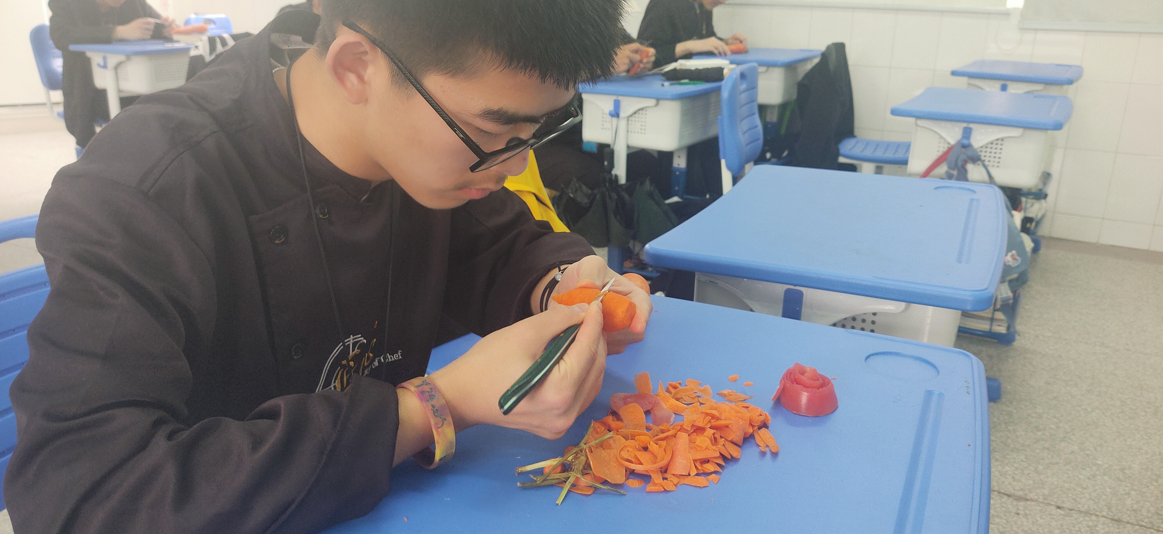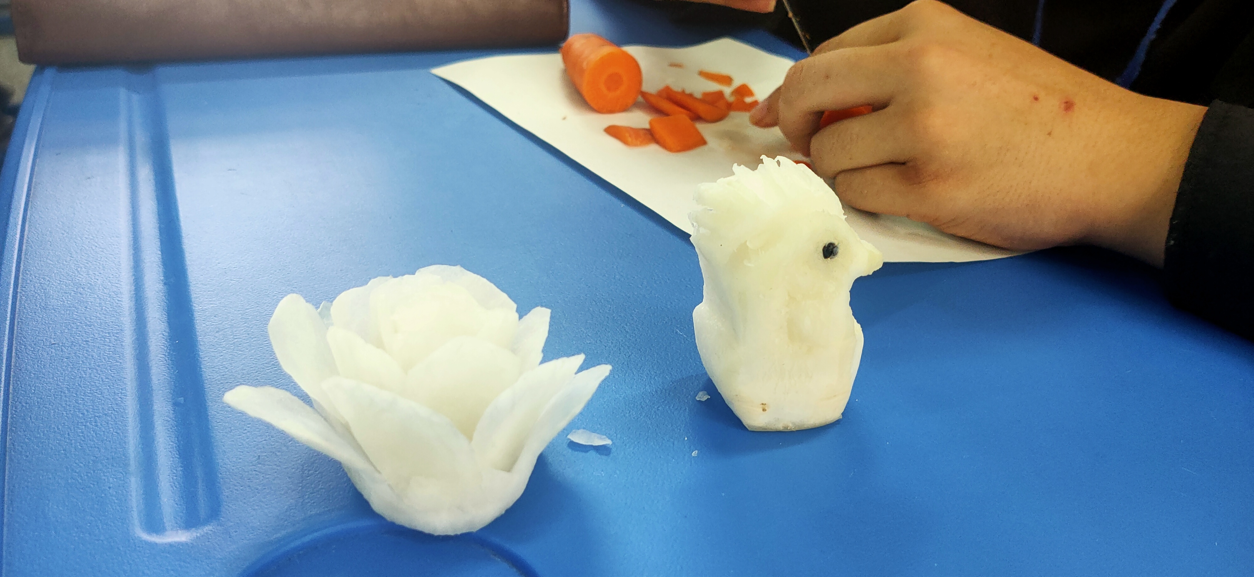 大家还进行了“雕刻萝卜”的小活动,各自拿出了看家绝活,为现场带来了秀色可餐的展示表演。通过这样的实践活动诠释了劳动美丽和奋斗荣光。作为厨师,把菜做到极致,这正契合工匠精神的实质内涵。