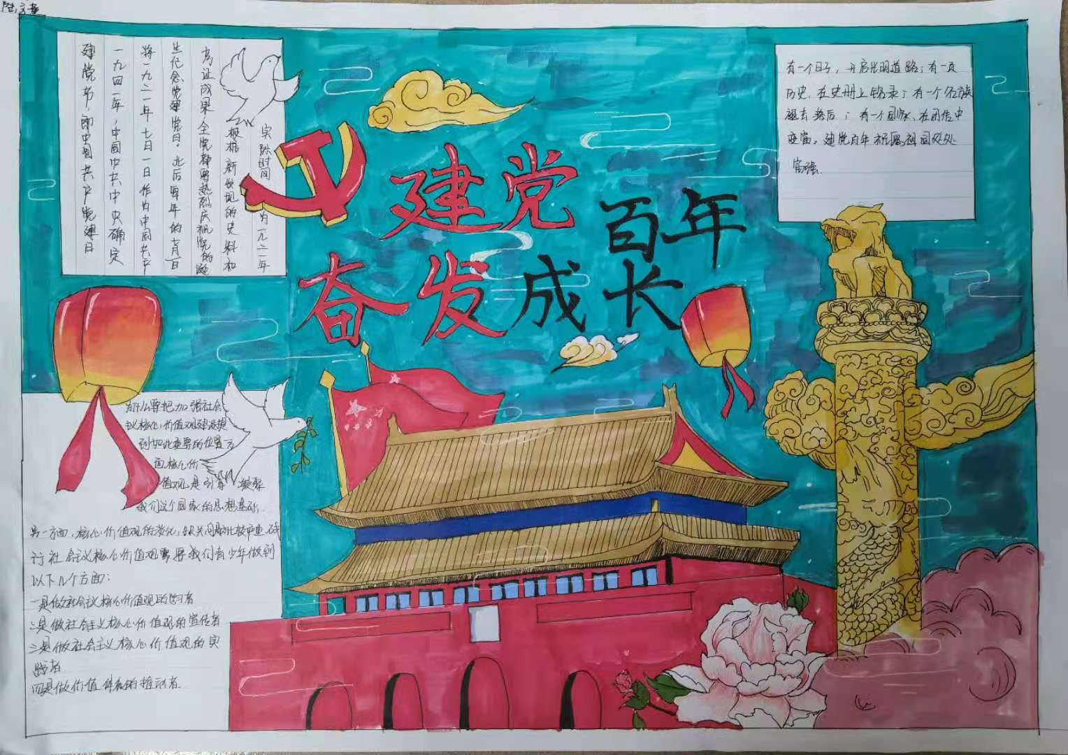 今年是中国共产党成立100周年,为了纪念党的生日,引导学生认识到党的光辉历程,怀念过去,展望未来,明白新时代的少年所肩负的责任。经贸管理系部学生助理于秀老师组织举办,关于“建党100周年”的手抄报比赛活动,并取得了圆满成功。各班同学都踊跃报名参加,提交了丰富多彩的作品。有的呈现党的光辉业绩,有的呈现党的奋斗历史……展现了良好的素质能力和爱党情怀。