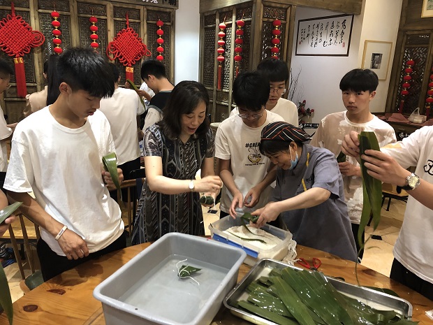 做完香囊,大家又在老王子厨师的指导下学做包粽子,虽然都是男生,但同学们虚心学习包粽子的技巧,做起来有模有样。在物质极大丰富的今天,人们对吃穿已没有往昔的渴望,但居安思危,引导青年学生学史明志。珍惜当下美好的生活,帮困扶弱,共同促进社会和谐发展。