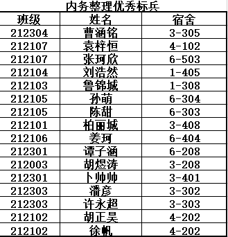 “玉瓷之石,金刚试之。”在曹书记的组织下,以班级为单位,各方 阵推选出两位代表参与“叠被技能大比拼”。经过二十分钟的精细化整理,代表们各显神通,一个个“小豆腐块”们新鲜出炉,赢得了全场掌声,进一步点燃了新生宿舍文明建设的热情。经过系部领导们的精心评选,共计16位同学被评为“内务整理优秀标兵”,他们是: