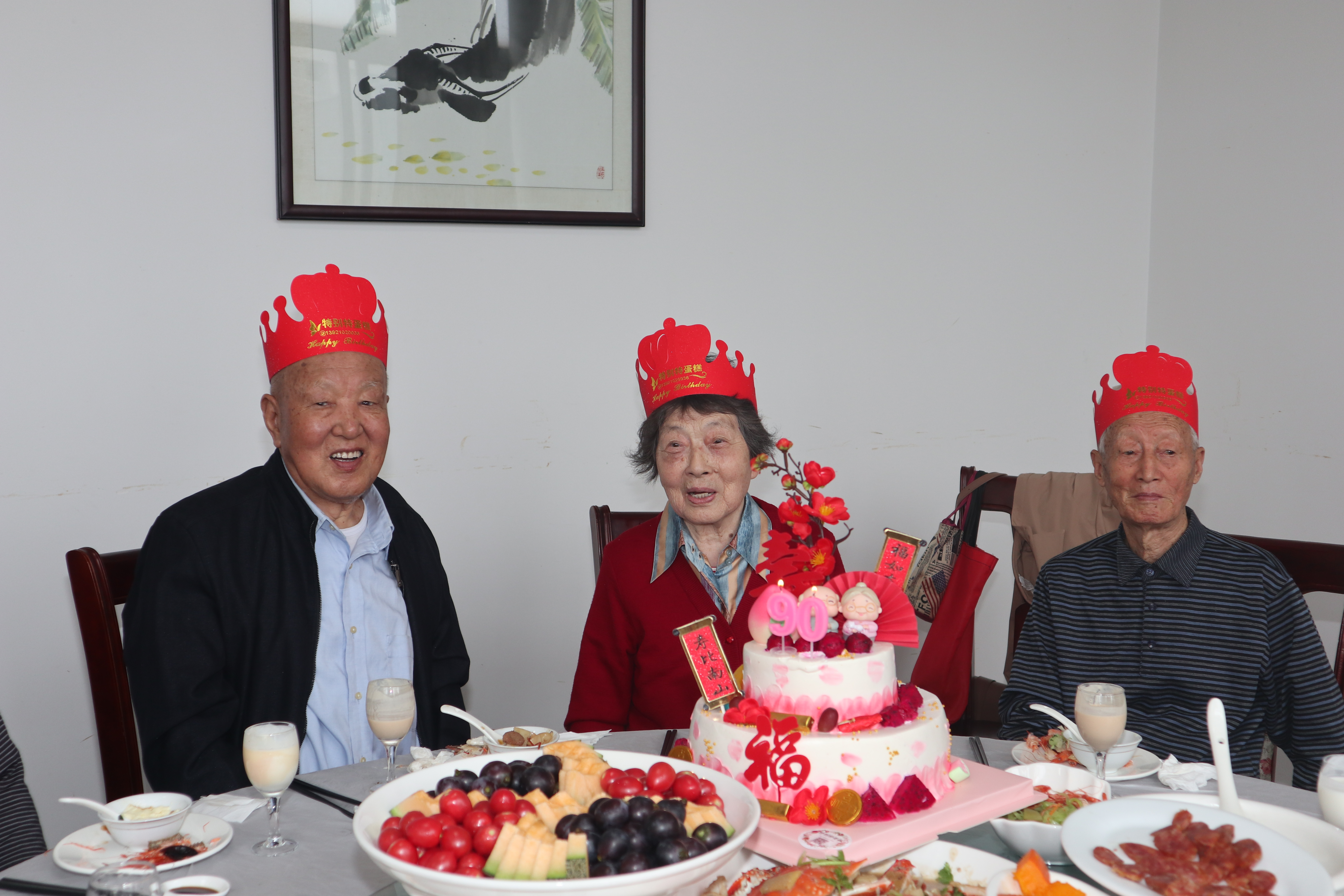 中午,大家共聚在学校的教工餐厅里,寿星们点蜡烛、吹蜡烛、许愿,接受学校为他们准备的生日礼物。老寿星们品尝着学校特地为他们定制的生日蛋糕,激动万分。90岁老寿星葛惠荣老先生更是现场赋诗一首: