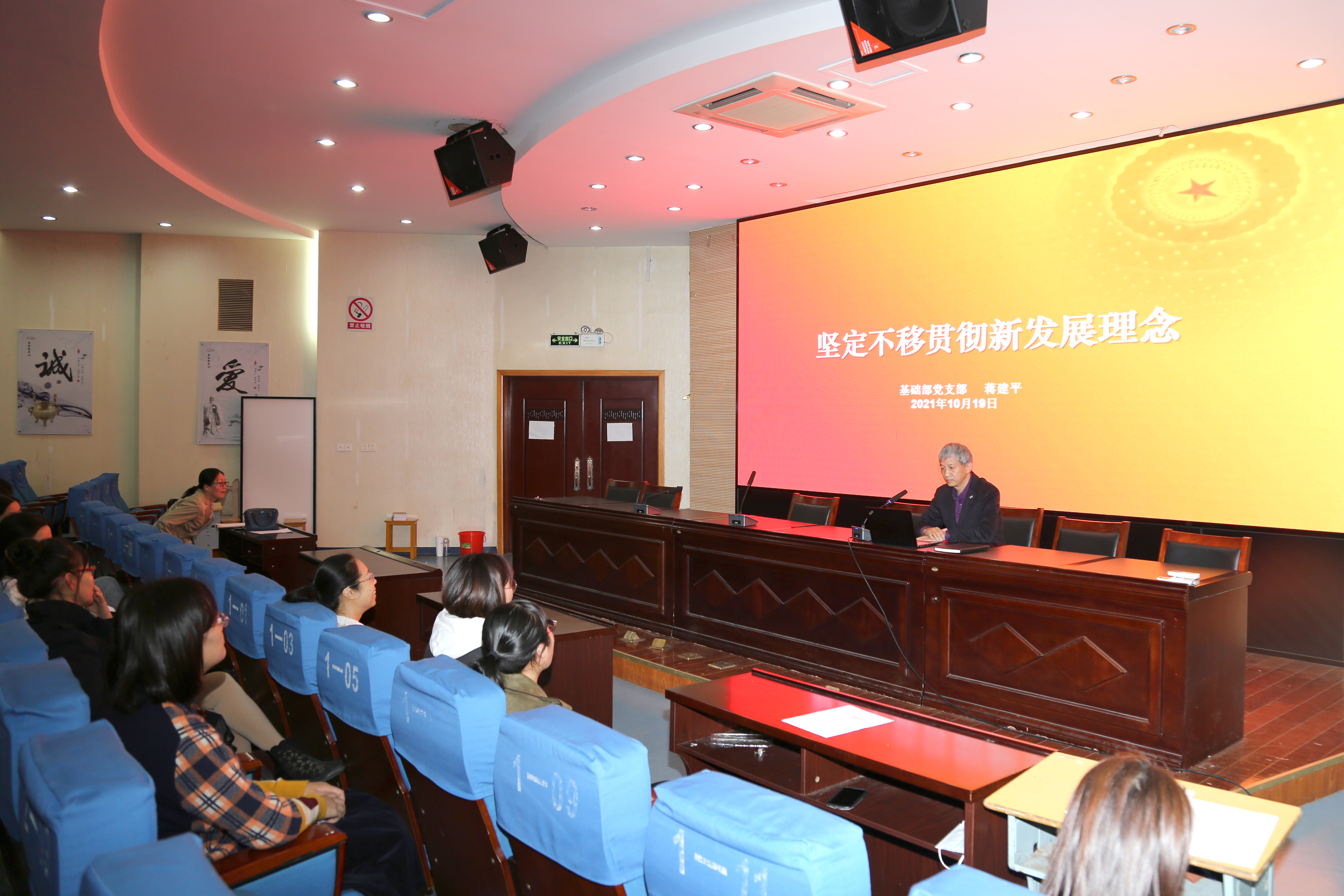 党员教师们踊跃发言,蒋建平老师从“新发展理念是引领我国发展全局深刻变革的科学指引”、“新发展理念的丰富内涵”等三个方面阐释了坚定不移贯彻新发展理念的必要性。