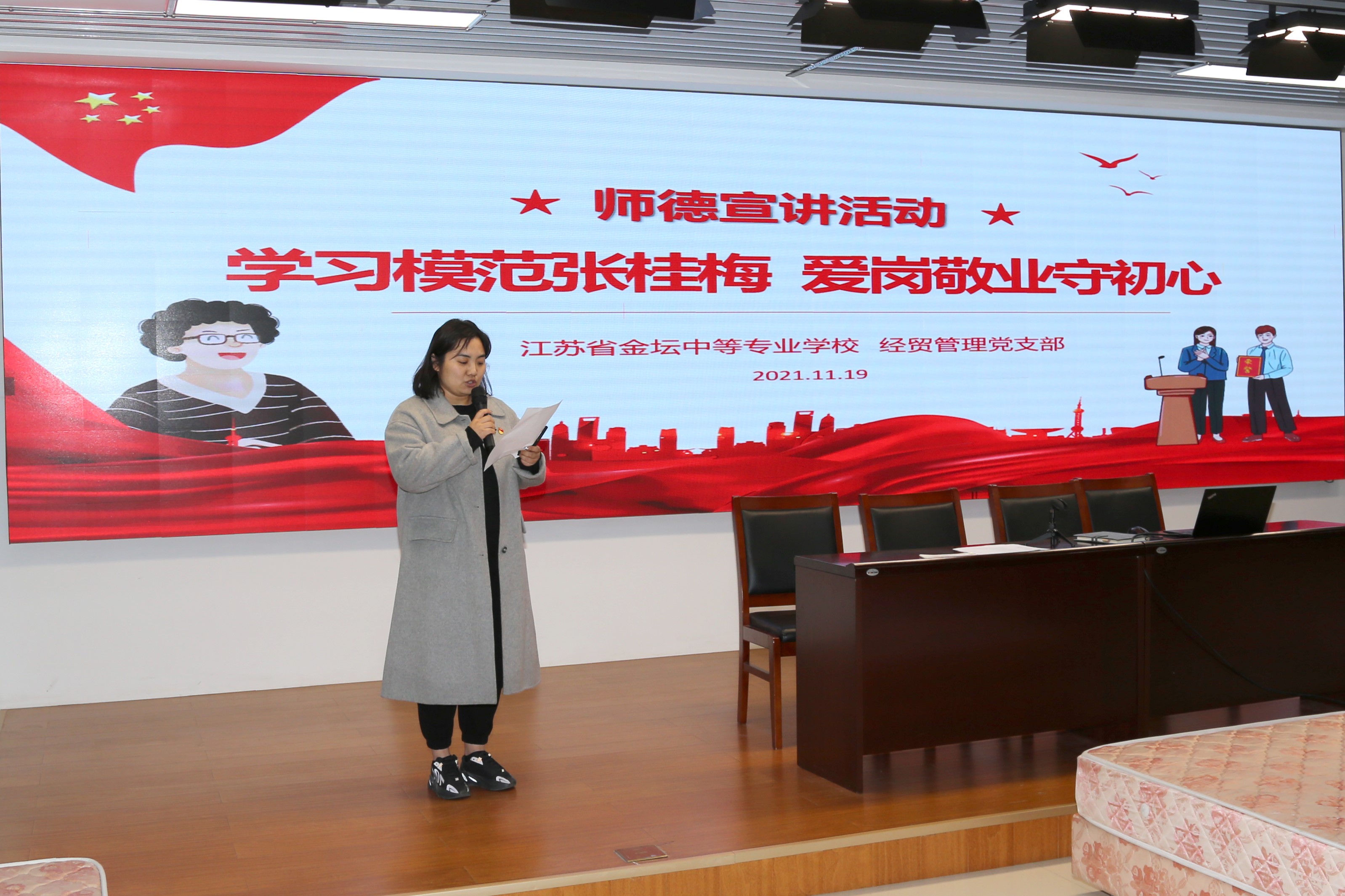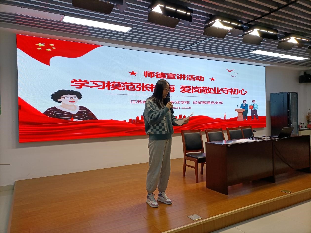 为积极响应中共常州市委宣传部和中共常州市委教育工作委员会联合发文开展的“学习模范张桂梅,爱岗敬业守初心”主题活动,激发广大教师教书育人的积极性,弘扬高尚师德,全面落实立德树人根本任务,学校经贸管理系党支部于11月19日下午在校旅宾实训室举行了以“学习模范张桂梅,爱岗敬业守初心”为主题的青年党员教师演讲比赛,支部书记黄火俊同志主持,支委、支部全体党员参加了活动。