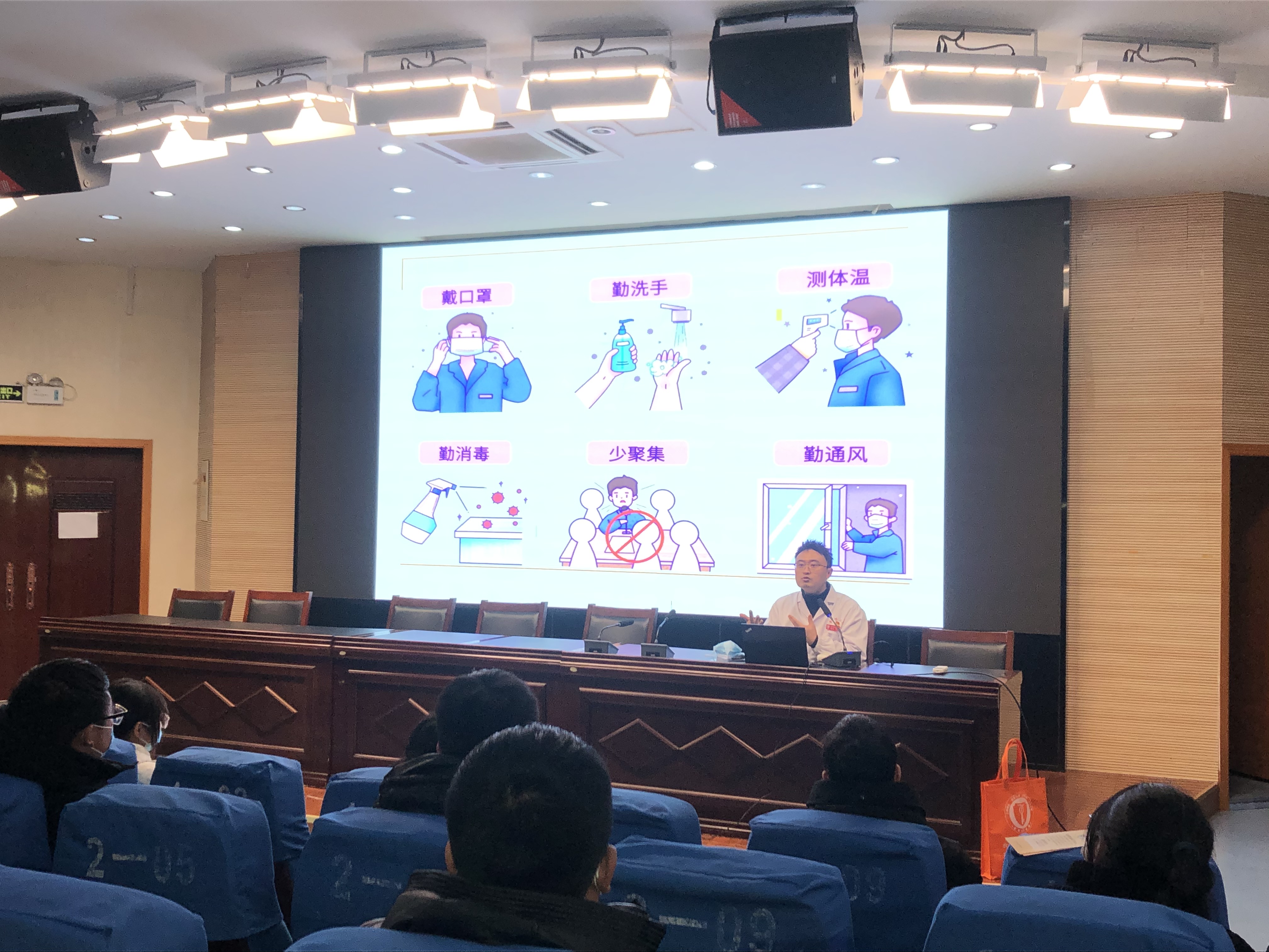 区第二人民医院健康教育科曹江鸣医生围绕认识病毒、了解病毒来源、传播途径、如何预防、口罩的使用、正确洗手等多个方面展开培训,并结合学校实际防疫工作做了深入浅出的讲解。