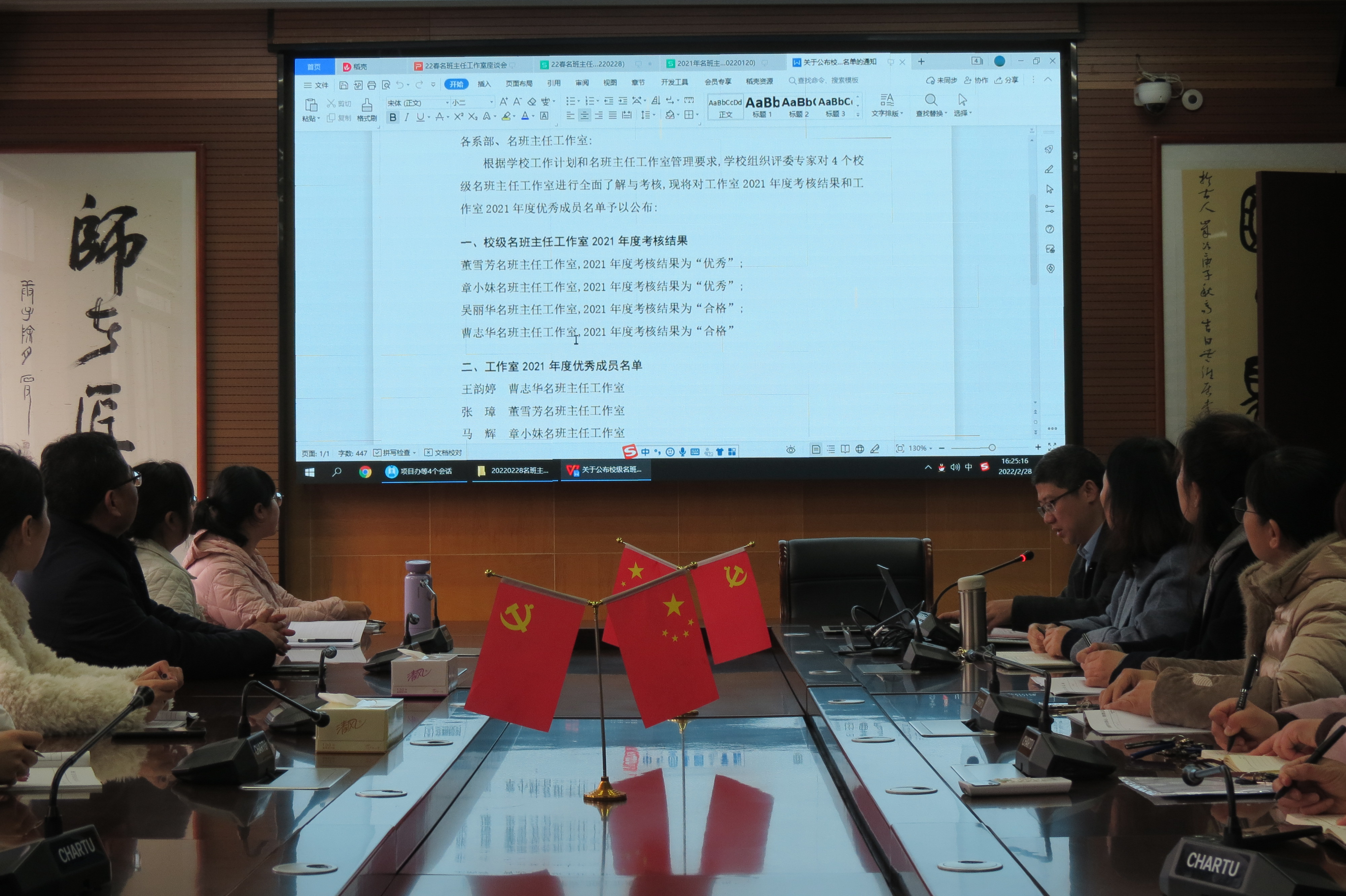为进一步加强班主任队伍建设,推广优秀班主任的管理经验,充分发挥我校名班主任工作室的辐射和孵化作用和常州市名班主任的示范、引领作用,打造我校班主任工作室的品牌、特色。2022年2月28日下午,我校在行政楼308会议室召开了名班主任工作室座谈会。汤英俊副校长、学生工作处、各系部有关人员、名班主任工作室领衔人参加,座谈会由学生工作处李志斌处长主持。