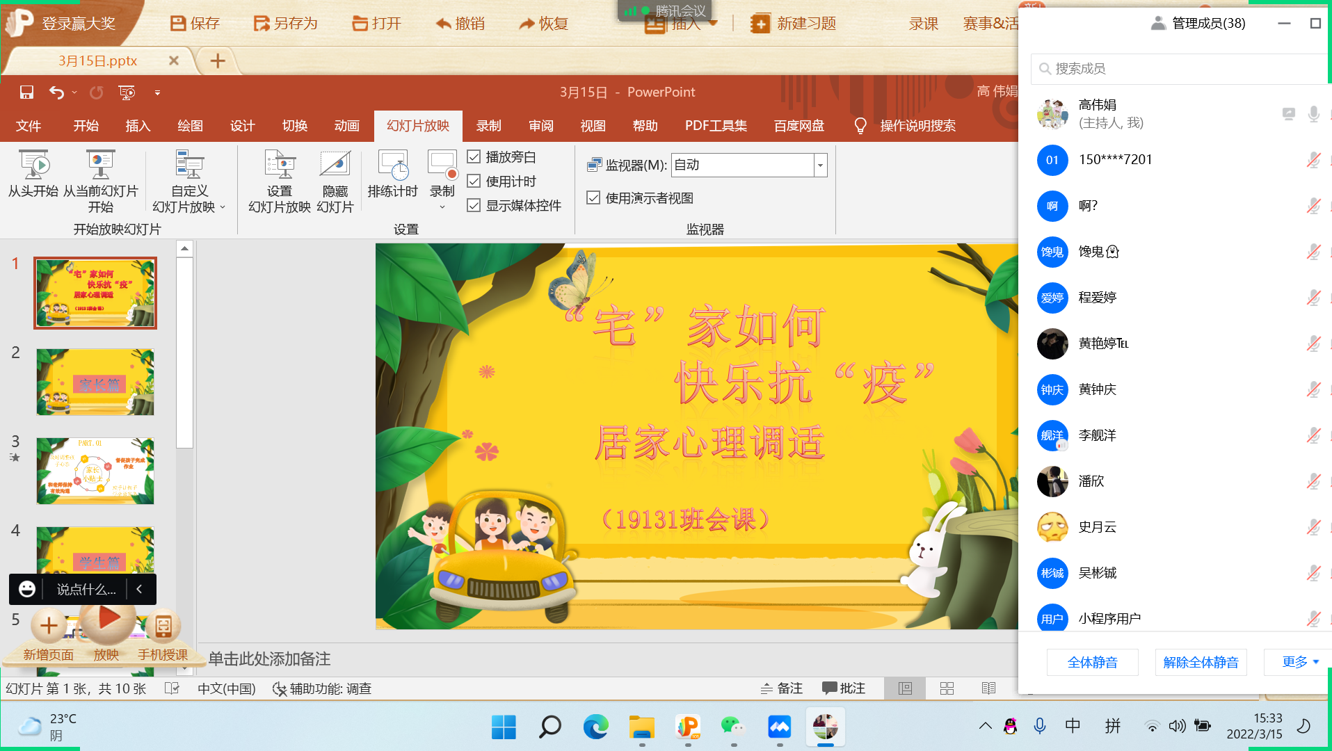 为进一步深入贯彻落实上级部门关于疫情防控工作的要求和部署,全面了解学生学习情况和思想动态,加强班级管理,增强班级凝聚力,3月15日,在学校党政领导下,我校各班立足职校学生特点,利用网络新媒体技术,开展了形式多样、内容丰富的线上主题班会。有计划地将学生自主学习与心理健康教育、居家劳动、体育锻炼、艺术教育、家校共育等内容有机结合起来,让学生居家学习生活劳逸结合,全面发展。
