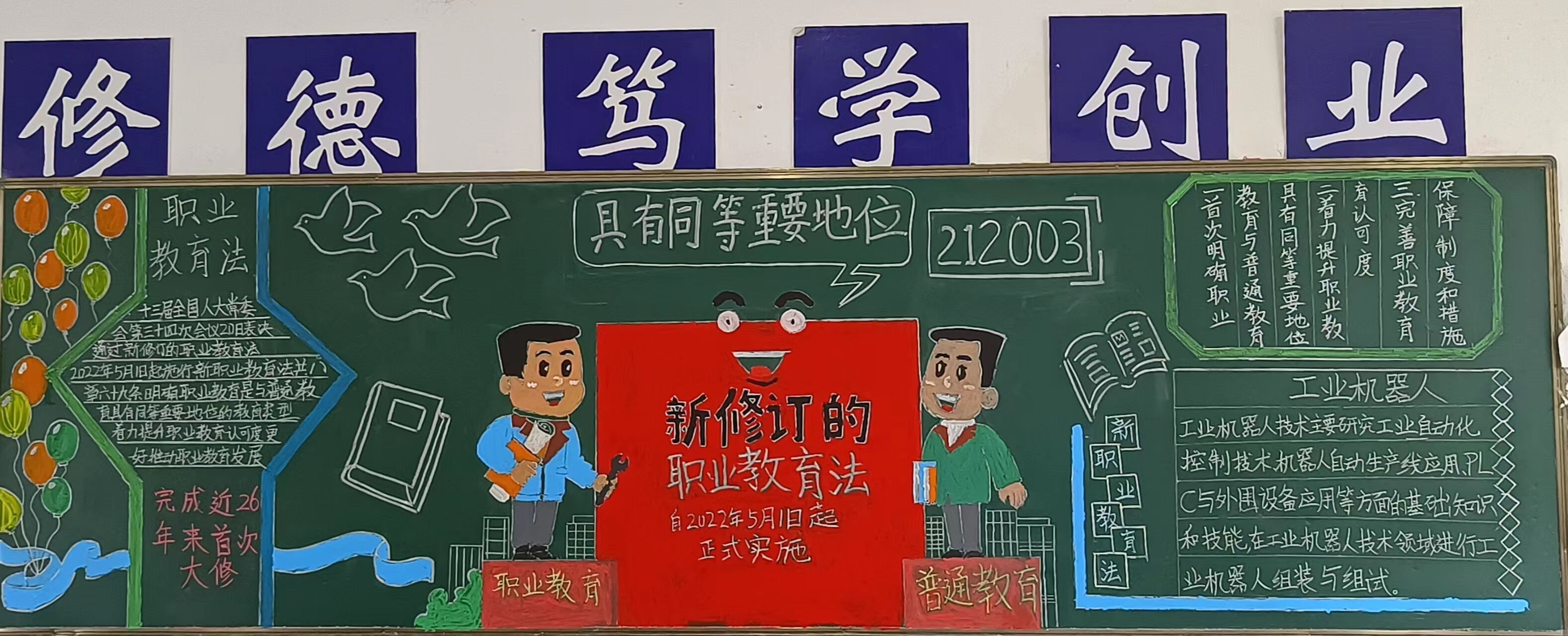 为深入宣传学习贯彻《中华人民共和国职业教育法》,扎实推动职业教育高质量发展,作为2022年职业教育活动周内容之一,我校党总支组织全体学生通过黑板报、主题班会及学生职业生涯发展规划等各种形式深入学习贯彻《中华人民共和国职业教育法》。