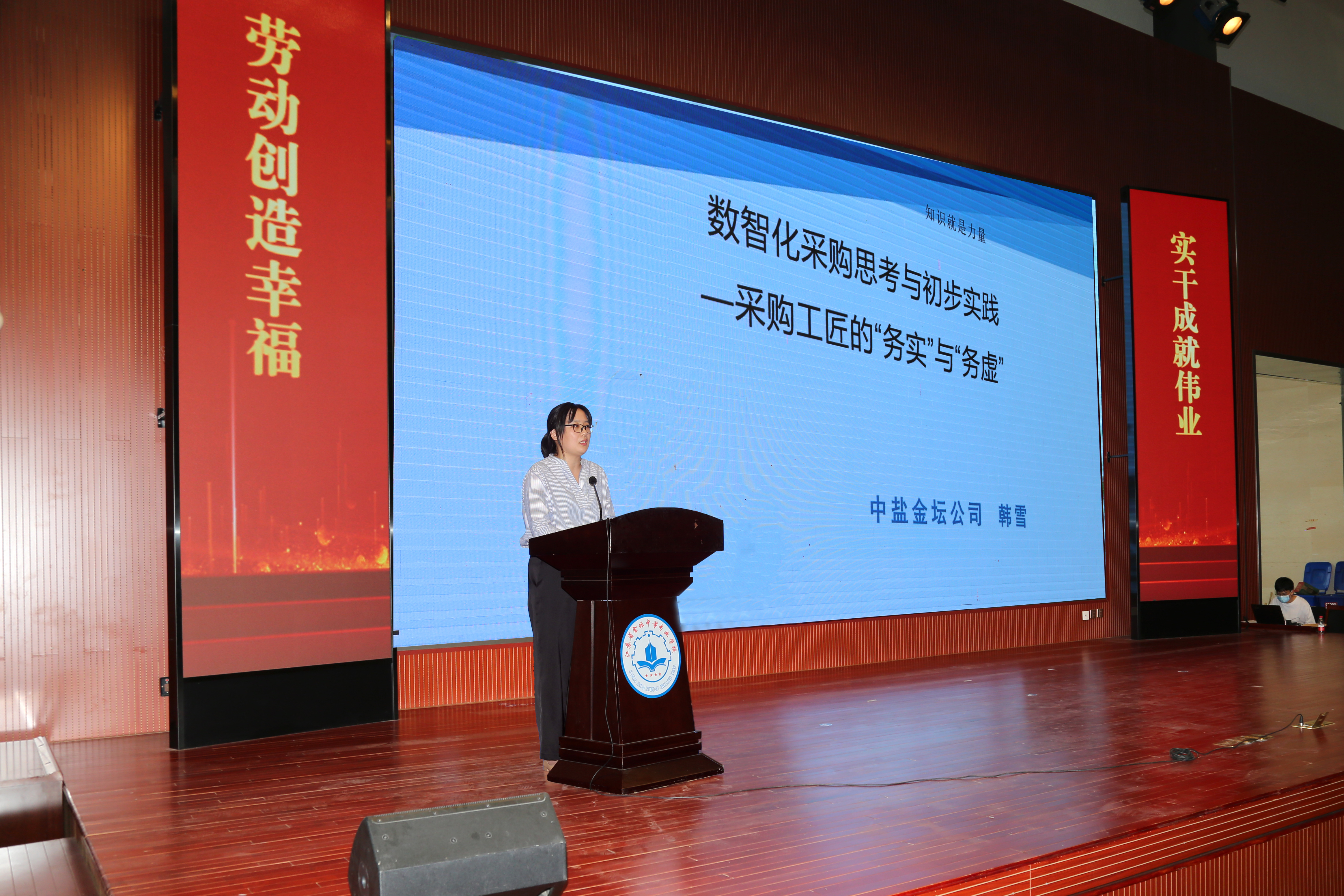 江苏省劳模模范、中盐金坛盐化有限责任公司采购主管——韩雪随后上台作了主旨演讲。她首先用了一个短视频向大家介绍了盐的性质和构成,让大家初步了解了她的行业。接着,她用朴实无华的语言介绍了她的工作经历,她致力于让金坛盐打入国际市场,创新开启盐企采购新模式,打造“贤文化”优质采购团队,短短几年时间,成功开拓了爱尔兰、新西兰等7个国际市场,平均每年为公司节约采购资金共计1500万余元,她所带领的采购团队每年完成采购任务约5亿元。她分享的成长经验和数智化采购背后所折射的是对知识无止境的探索与学习,这是对金沙学子的鼓舞和指引,也是对广大师生的激励和鞭策。随后,韩老师还和现场的师生进行了互动,为学生代表佩戴“智慧之星”徽章,将象征着劳模精神、劳动精神、工匠精神的徽章悬挂在下一代社会主义建设者和接班人的心中。