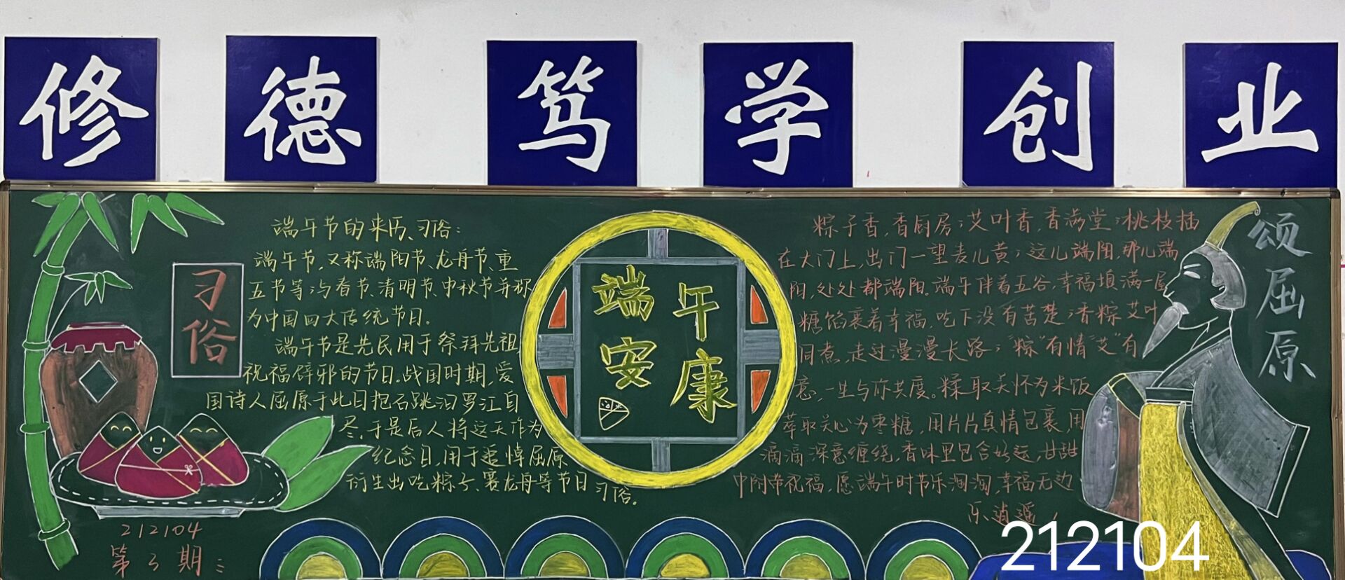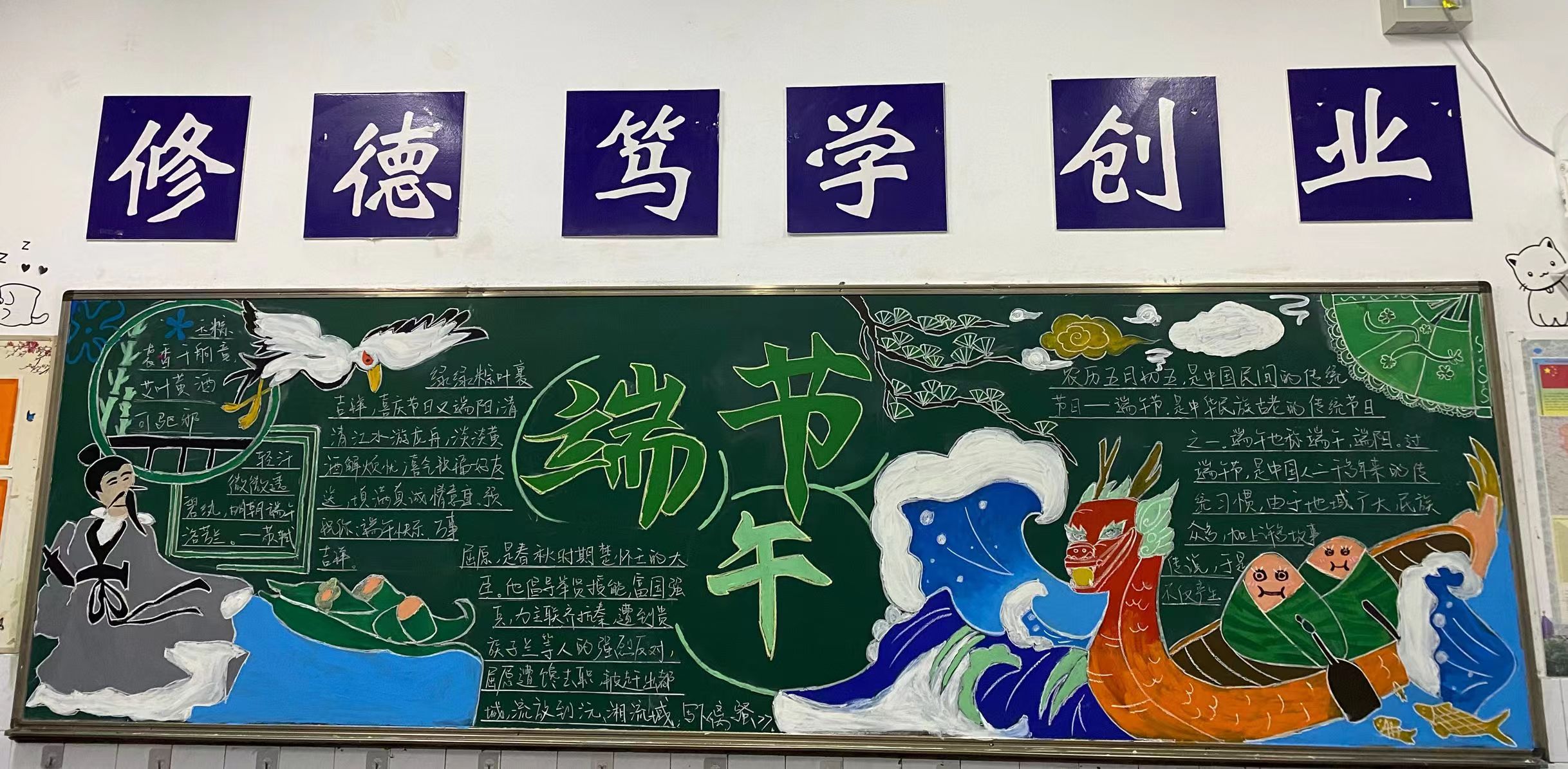 5月31日,各班开设端午节主题班会,同学们充分了解端午节的由来、习俗、文化影响、经典诗词等。同学们共读《史记》中屈原的故事,通过了解屈原的经历,对其爱国主义情怀产生了极大的敬佩,树立了为中华之崛起而读书的远大志向。同时各班以纪念屈原、赛龙舟、包粽子等为主要元素,精心策划,分工合作,多渠道搜集资料,巧妙排版设计创作了一幅幅图文并茂的黑板报作品。