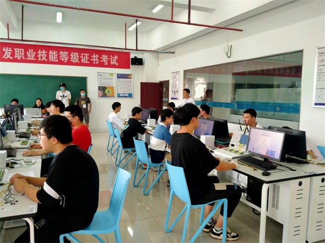 为提高学生职业发展的综合能力,金坛中专智能制造系成功开展了应用电子技术专业领域1+X传感网应用开发职业技能等级证书试考评。6月18日,金坛中专应用电子技术专业12名学生在金坛中专考点参加1+X传感网应用开发职业技能等级证书考试。考试分理论知识考核及实操考核,全面检验学生的理论素养和实操能力。 考前,从实训室、考务办公室、备料室、考场的安排布置以及各种物资的购买到师资培训、考前动员、考前培训、模拟考试、考务安排等方面进行了精心筹备。