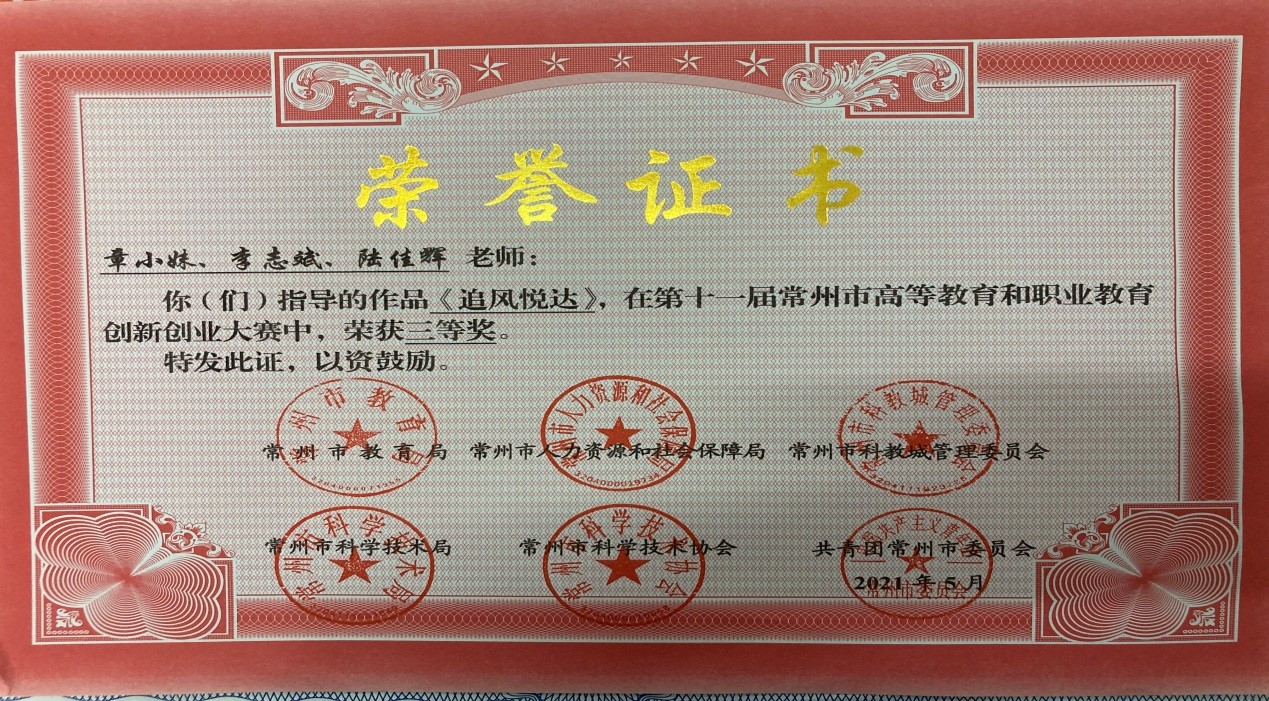 (6) 2021年4月 章小妹指导唐远培团队参加第十一届常州市创新创业大赛获常州市“三等奖”。