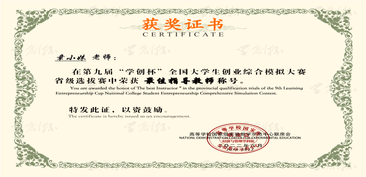 (1)在2022年5月第九届“学创杯”全国大学生创业综合模拟大赛江苏省主体赛道选拔赛中,章小妹指导唐远培团队荣获江苏省“特等奖”!章小妹老师获“最佳指导老师”。
