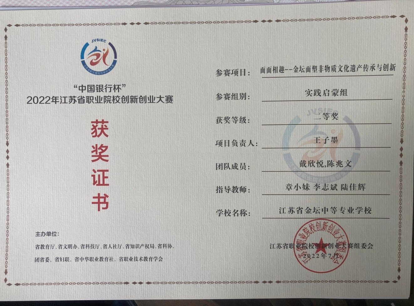 (4)2022年7月 章小妹指导王子墨团队参加2022年江苏省职业院校创新创业大赛荣获江苏省二等奖。