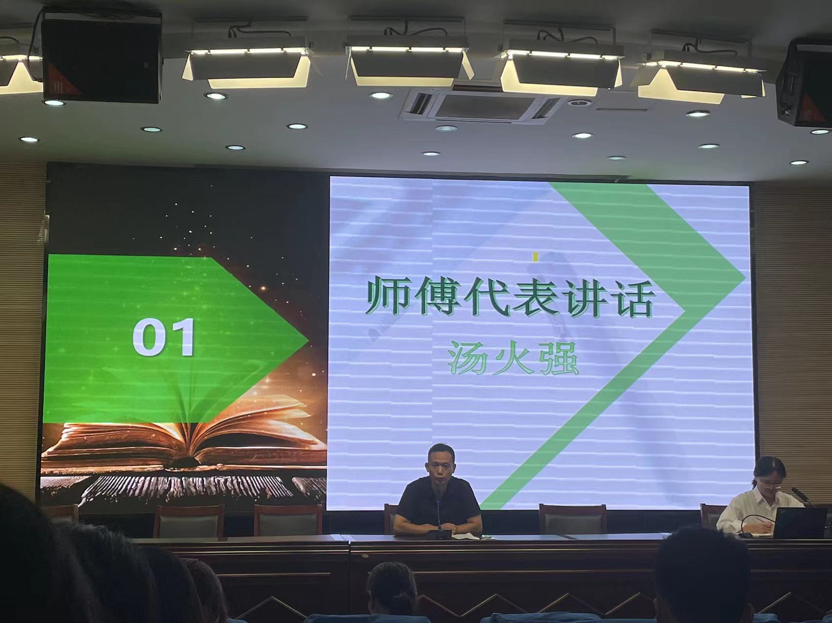 第一阶段举行了青蓝工程结对仪式。语文组汤火强老师作为师傅代表发言,承诺将把自己的经验毫无保留地传授给徒弟,倾囊相授,和新教师共同成长。