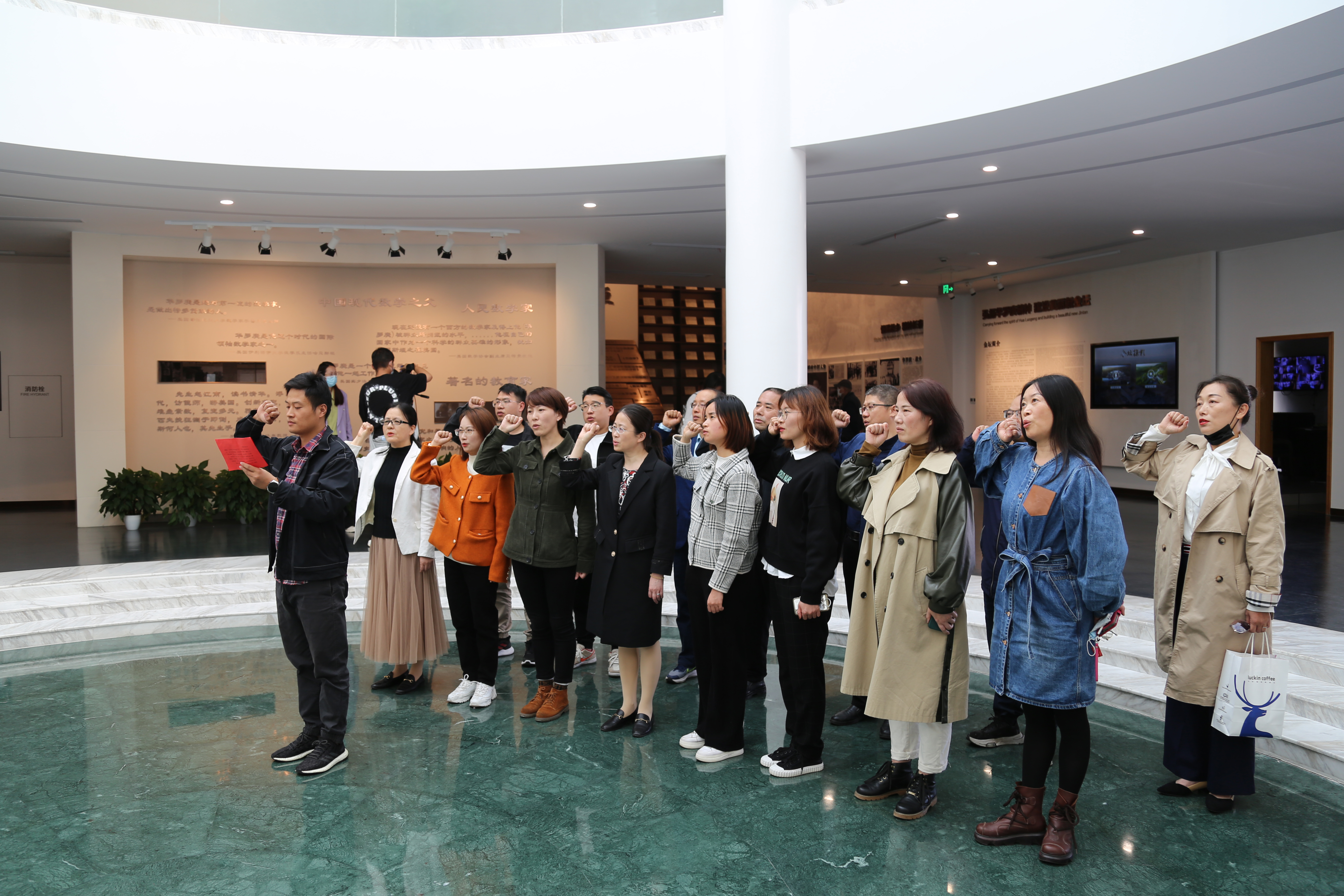 在华罗庚塑像前,党员代表和盟员教师代表在金坛区第十届“十佳青年教师”徐风山老师的带领下庄严宣誓,重温从教誓词。
