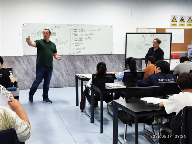 外教在教学过程中他强调德国职教理念,运用行动导向教学模式组织教学,“资讯”、“计划”、“决策”、“实施”、“检查”、“评估”,每个环节都能够严格要求学生分工明确精准到位,对实训室的设备设施的规范使用也提出了自己的意见和建议,同时特别关注安全文明生产的规范要求。