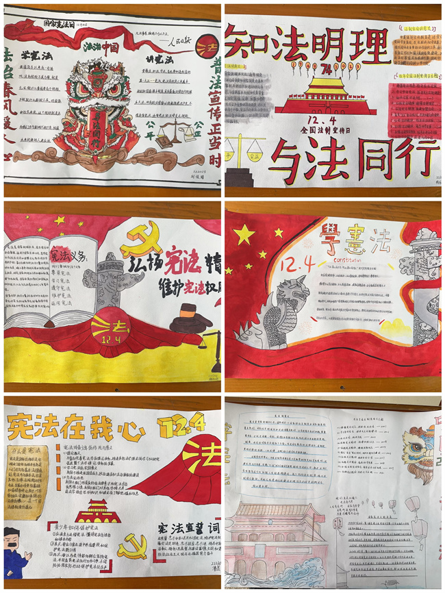4.为充分发挥板报阵地在学校教育宣传活动中的作用,宣传学校的相关精神,丰富同学们的视野、增长见识,学校学工处精心策划开展了以宪法为主题的班级板报评比活动。同学们用书写和绘画的方式与法治元素相结合,呈现了一幅幅精美的宣传画和手抄报,这些设计新颖、构图巧妙、色彩斑斓的作品里蕴含了同学们对宪法的理解与感悟。