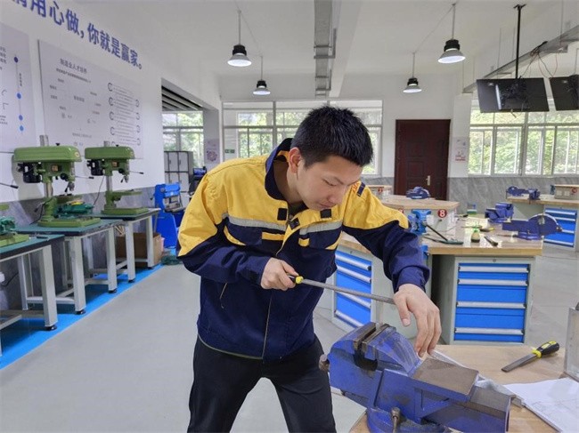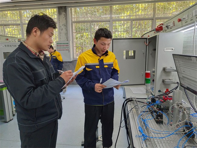 考核分为理论和实操两部分。理论考试90分钟开卷,主要以选择题为主,通过查找手册等考查学生的机械、电工、液压等多学科知识的掌握情况。实操考试6.5小时,分为计划、检查、实施,要求学生能根据任务的要求独立完成钳工的加工、装配,电气的接线、调试等。最后通过机、气、电的配合,进行连贯的加工运行过程,整个过程的学习及最后考核都是依照德方的要求,提高了学生的动手能力和专业知识。考官们严格按照德方考试的标准要求对学生进行合理评价,认真履职、公平公正。