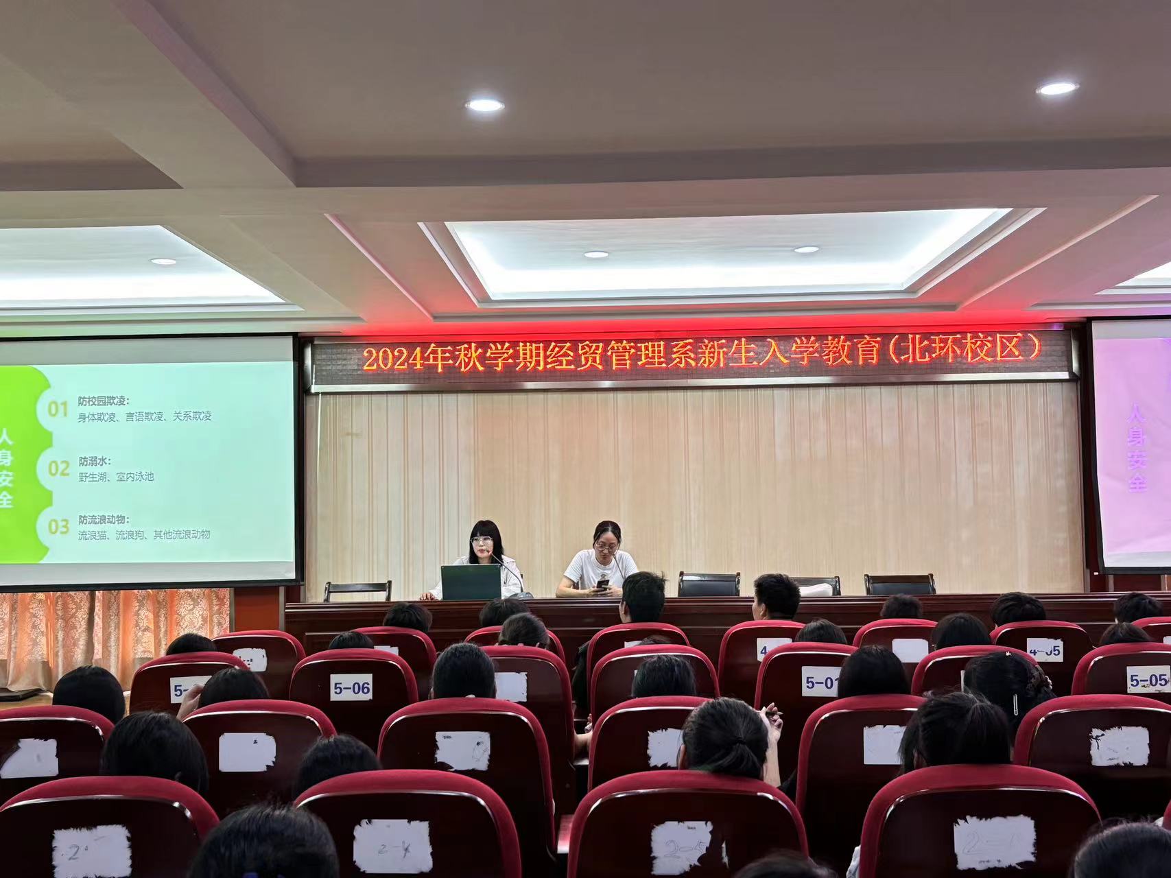 2024年9月,经贸管理系迎来了一批朝气蓬勃的新生。为了帮助新生更好地适应新学校、新环境,为未来的学习生活打下坚实的基础,2024年9月18日下午七八节课,我系举办了一场别开生面的新生入学教育讲座。汇贤校区的讲座由张璋主任主持,北环校区的讲座由高雅主任和冯贝安老师主持。两个校区共7个新生班级的学生均由班主任带领到场聆听讲座。