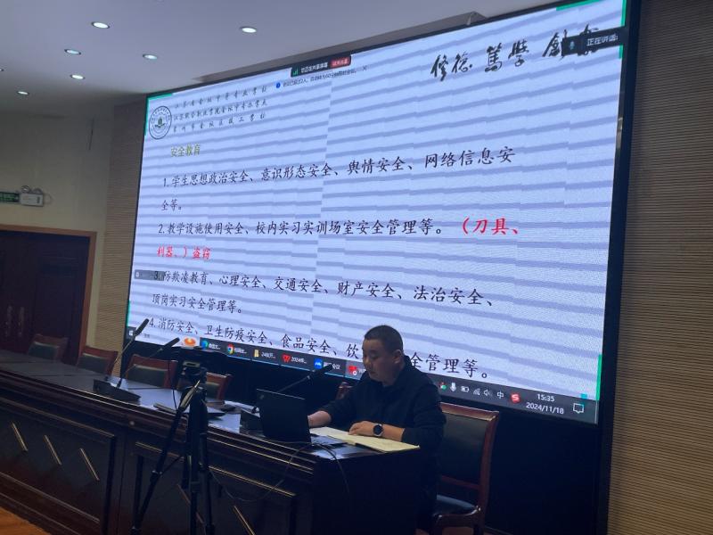 会议伊始,学工处谌勇处长对当前校园安全形势进行了全面分析,通报了近期省内外校园安全事件,并结合我校实际情况,指出了存在的安全隐患及可能面临的风险点。通过生动的案例讲解,使大家深刻认识到安全工作的重要性与紧迫性。并对学校的常规管理及近期工作进行布置。