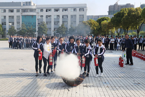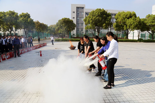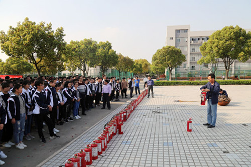 4月3日下午,消防演练在学校广场举行。本次消防演练进行了真火灭火实操,校党总支副书记李建中亲临现场,学工处处长张贵夕首先讲解了灭火器材的使用方法和操作步骤,后勤服务处处长徐江现场示范了灭火规范操作。随着模拟着火点的火势越来越猛烈,演练人员迅速举起干粉灭火器,先拆掉保险销,一手握紧手柄,一手抓牢喷头,对准火源,按下手柄,干粉猛然喷出,大家齐心协力,很快将熊熊大火扑灭。