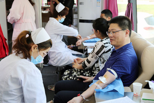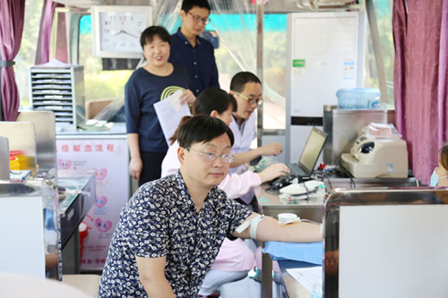 在献血现场,老师们认真填表、体检、化验、抽血,所有流程都在医护工作人员的指导要求下井然有序的进行。他们每个人的脸上洋溢着快乐的笑容,切身感受到了爱心奉献带来的温暖与幸福。当鲜红的血液带着爱心流入贮血袋时,他们脸上个个露出了质朴的微笑。有的教师一次献血400CC,还有的已是多次登上献血车。更值得称道的是我校黄火俊、袁勤、张卫军等多位老师,坚持每年至少献血一次,多年来累计献血已超5000毫升。献血献爱心,女教工也不甘落后,许多女教工也勇敢地挽起了袖子,学校工会委员刘艳梅、王雪松夫妇,更是每年双双同时献血,爱心满满。下课后,已满18周岁的学生也积极地投入到无偿献血的队伍之中,他们以自己的行动,实践着18岁的青春承诺。