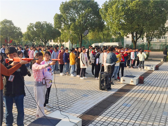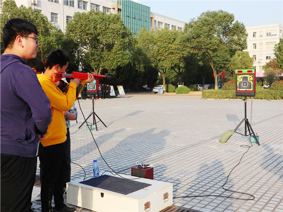 随后,同学们体验了电子模拟打靶比赛游戏。同学们分组整队集合,认真听取电子模拟枪支特点、射击方法、操作要领和注意事项,观摩学习规范的射击动作,然后跃跃欲试,纷纷上前尝试体验,随着同学们扣动扳机,广播里立即自动报出靶数,同学们纷纷称奇的同时相互讨论着各自的命中率,现场一片欢声笑语。