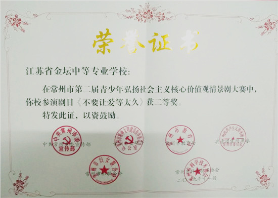 11月11日,常州市第二届青少年弘扬社会主义核心价值观情景剧大赛举行隆重颁奖仪式,我校代表队经过层层选拨与激烈角逐,荣获团队二等奖的优异成绩。指导老师于浩与蒲公英话剧社社长徐子珈代表学校参加颁奖。