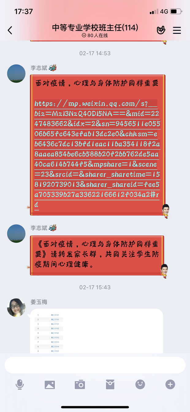 为了更好保障学校教师学生的生命安全和身心健康,学校密切跟踪教师、职工、学生的身体健康状况,引导师生在疫情防控期间合理自学,适当开展室内体育锻炼,健康娱乐,放松自我,为师生返校复课做好充分准备。同时,学校通过公众号、微信群等方式向家长和学生推送防疫心理知识,普及心理健康维护常识,畅通网络心理辅导服务渠道。班主任也随时关注学生心理状态,重视学生心理干预与辅导。