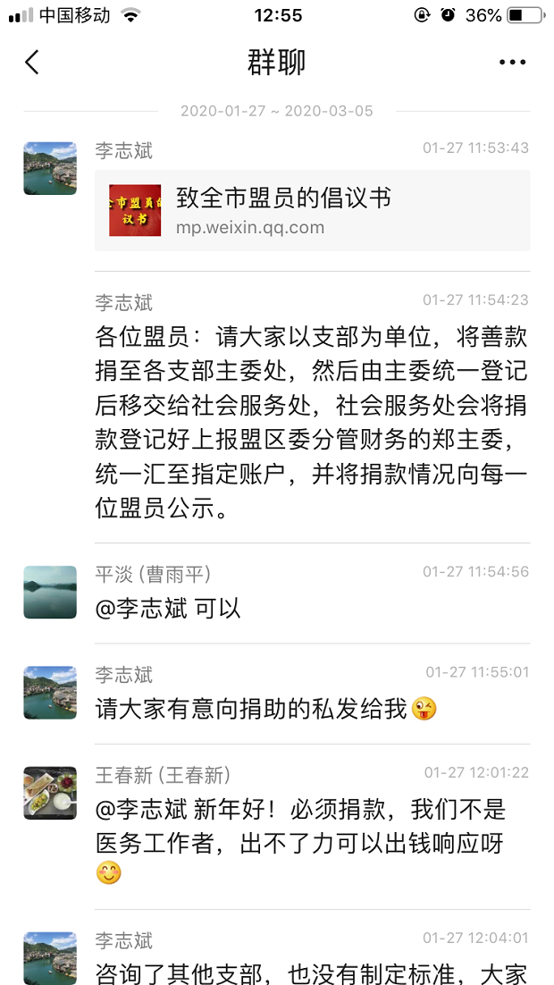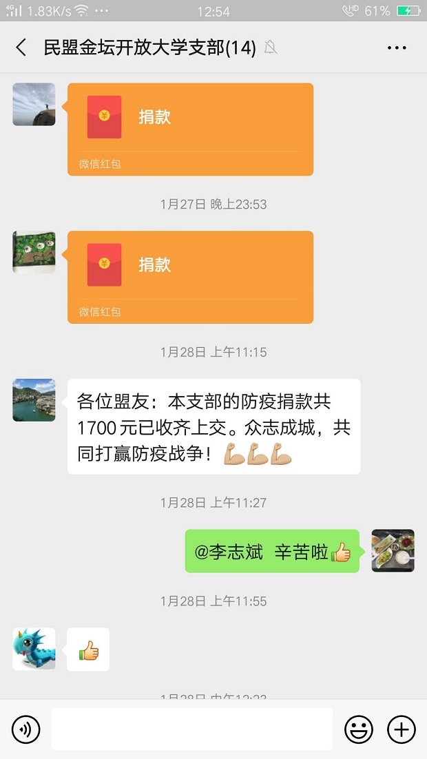 生命重于泰山,疫情就是命令,防控就是责任。在党总支的领导下,我校民盟支部也积极行动起来了。在李志斌主委的组织下召开了名盟支部电话会议,向盟员们发出自愿捐款倡议,盟员们积极响应,一致表示要增强”四个意识”、坚定”四个自信”、做到”两个维护”,在中国共产党的坚强领导下,发挥优势,主动作为,和全区人民一道,为打赢这场抗击新冠病毒疫情的战斗贡献盟员力量!