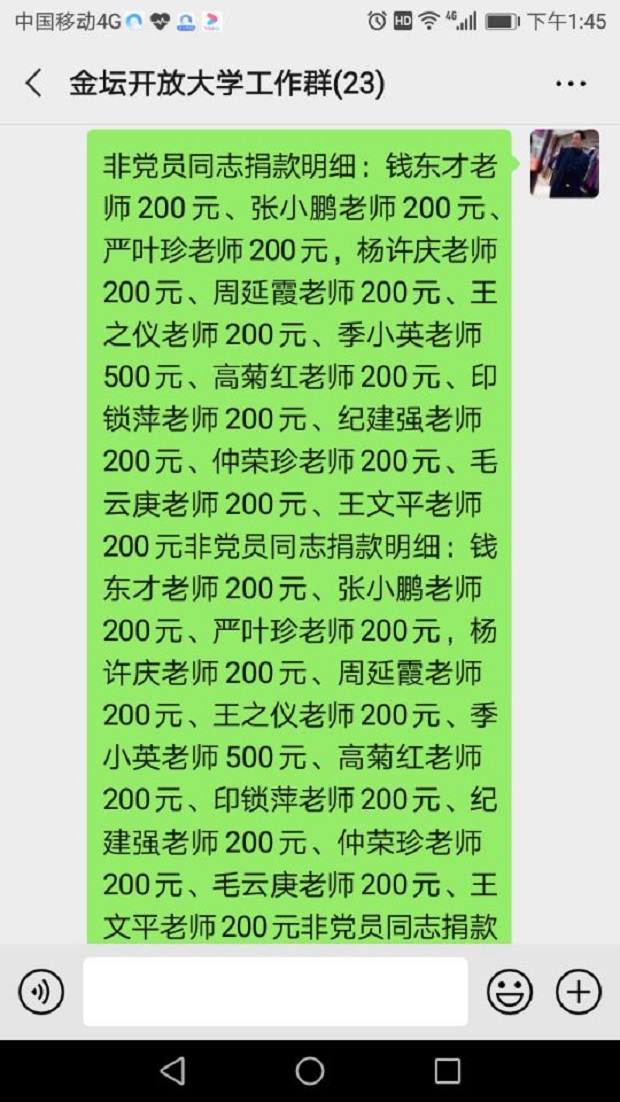 周延霞,三次捐款(1月28日捐给江苏省妇女儿童福利基金会100元,2月11日金坛红十字会200元,3月4日参加校教师捐款200元)共计500元支持抗“疫”,她说:“我虽不是党员,但我是土生土长的金坛人,尽己之能为疫情防控助力,我心里踏实。”