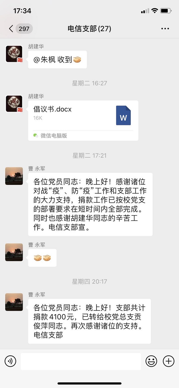 我校退休党员每天通过各种媒介关注疫情最新情况,对一线抗疫人员充满着崇敬和关爱,当看到我校党总支的自愿捐款倡议书后,他们主动打电话询问捐款事宜,以表达自己的真情和对一线工作人员的关爱。在捐款活动中,老党员们闻令而动,无论身处何地、家境如何,积极捐款,表达爱党爱国之心,彰显了老党员应有的政治品格和思想境界。