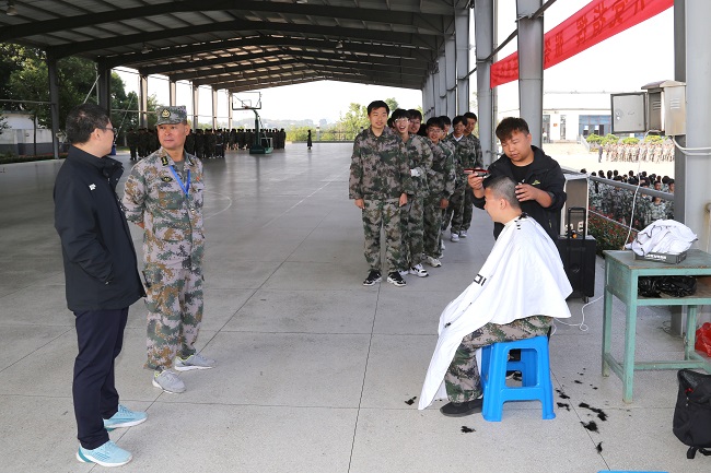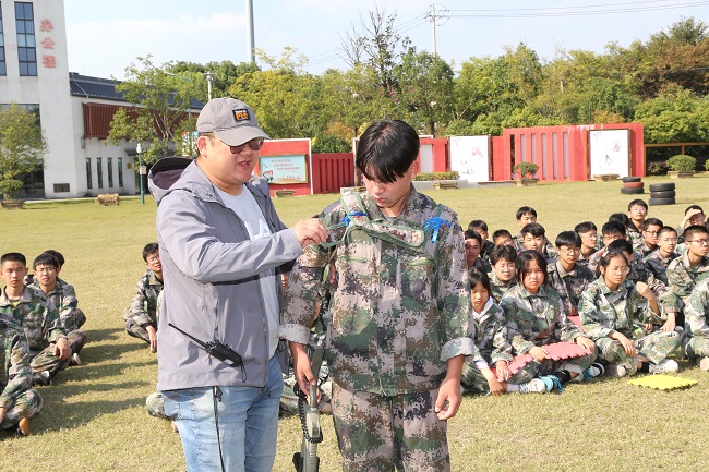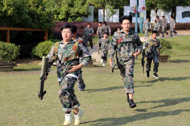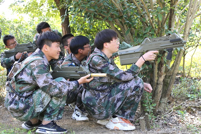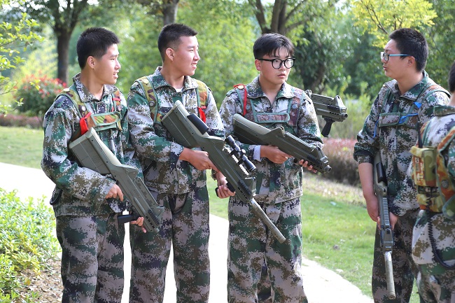 学校和基地还统一组织同学们进行了理发。 下午的训练我们去体验馆对面的山坡上玩CS。我们排好队伍坐在地上等待着上一个班结束。很快,那个班结束了,教官让我们排成两路中队,一队是红队,一队是蓝队。红队负责进攻,蓝队负责防守。上一个班将马甲和枪给我们,我们穿好马甲,手上拿好枪便上山了,很奇怪的是我刚上山就被打了一枪,我四处张望没看到是谁打的,我便小步跑起来,才过了几分钟的时间我的五条命就没了,我便跑到负责人那里复活。我刚复话准备上山,时间就到了,我们纷纷跑到负责人那将装备给下一波人。